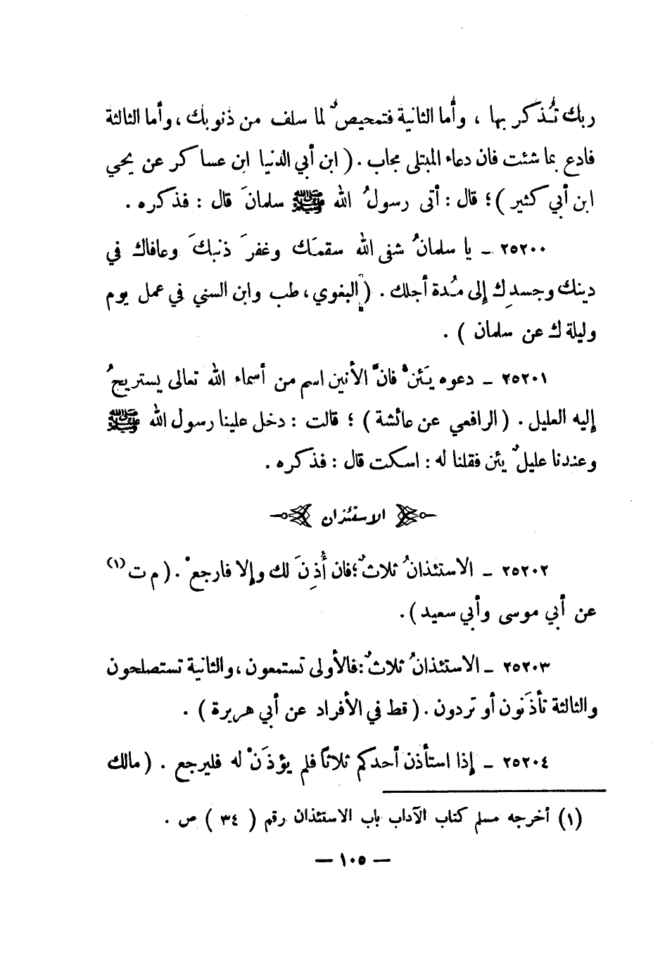 25200- "يا سلمان شفى الله سقمك وغفر ذنبك وعافاك في دينك وجسدك إلى مدة أجلك". "البغوي، طب وابن السني في عمل يوم وليلة ك عن سلمان".