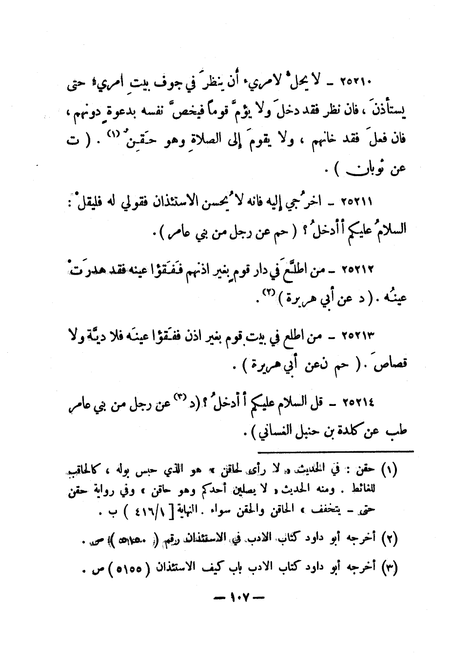 25214- "قل السلام عليكم أأدخل"؟ "د 3 عن رجل من بني عامر طب عن كلدة بن حنبل الغساني".