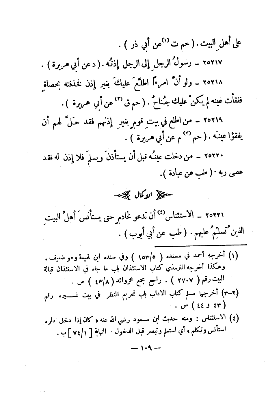 25221- "الاستئناس 4 أن تدعو لخادم حتى يستأنس أهل البيت الذين تسلم عليهم". "طب عن أبي أيوب".