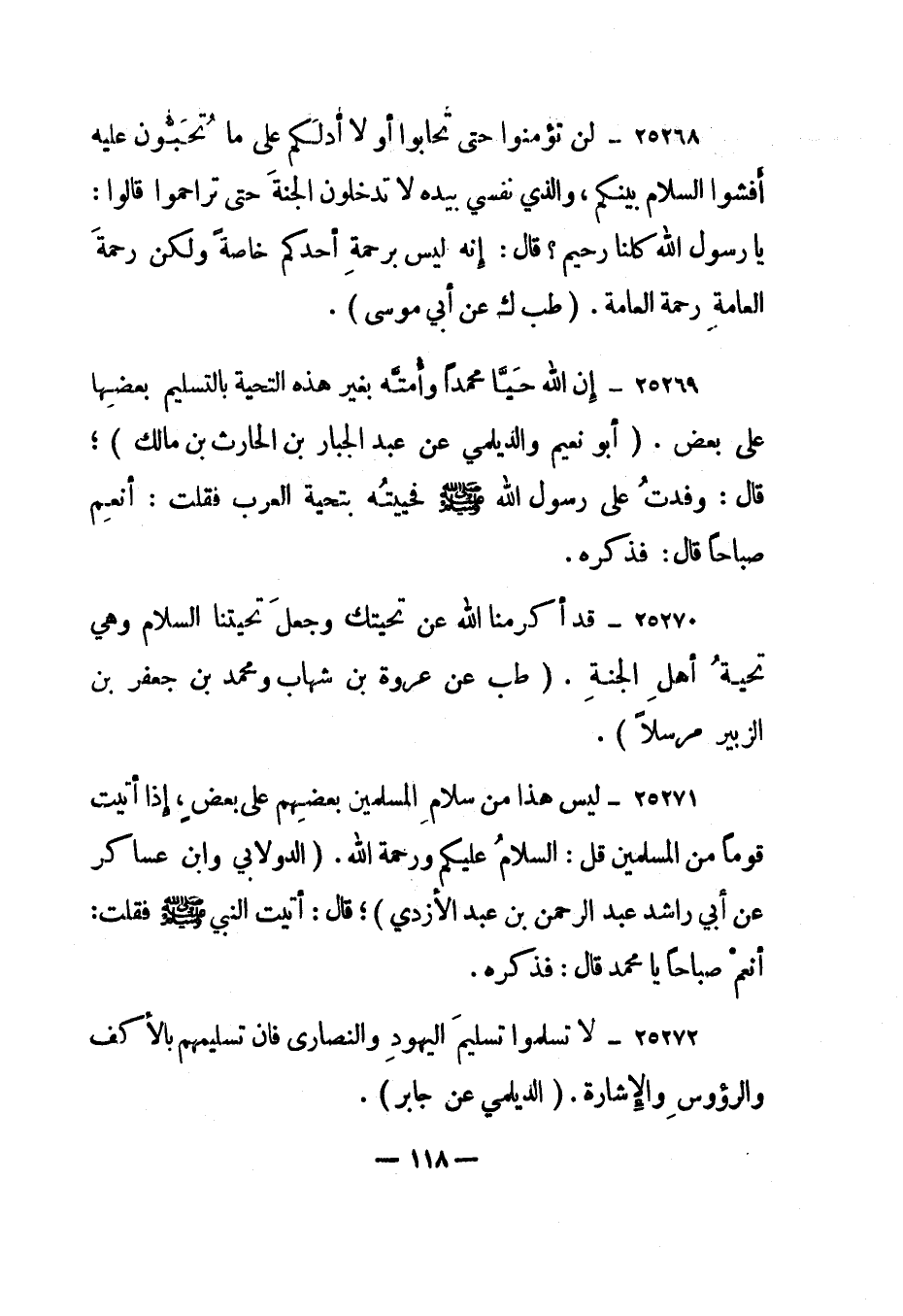 25272- "لا تسلموا تسليم اليهود والنصارى فإن تسليمهم بالأكف والرؤوس والإشارة". "الديلمي عن جابر".