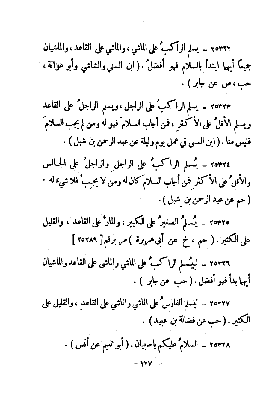 25322- "يسلم الراكب على الماشي، والماشي على القاعد، والماشيان جميعا أيهما ابتدأ بالسلام فهو أفضل". "ابن السني والشاشي وأبو عوانة، حب، ص عن جابر".