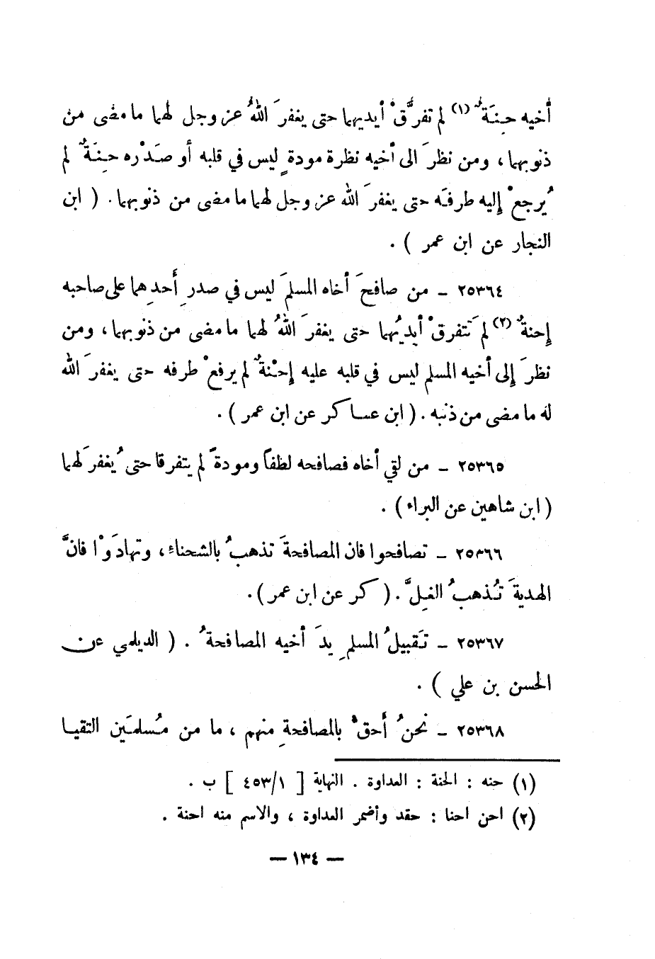 25364- "من صافح أخاه المسلم ليس في صدر أحدهما على صاحبه إحنة 2 لم تتفرق أيديهما حتى يغفر الله لهما ما مضى من ذنوبهما، ومن نظر إلى أخيه المسلم ليس في قلبه عليه إحنة لم يرفع طرفه حتى يغفر الله له ما مضى من ذنبه". "ابن عساكر عن ابن عمر".