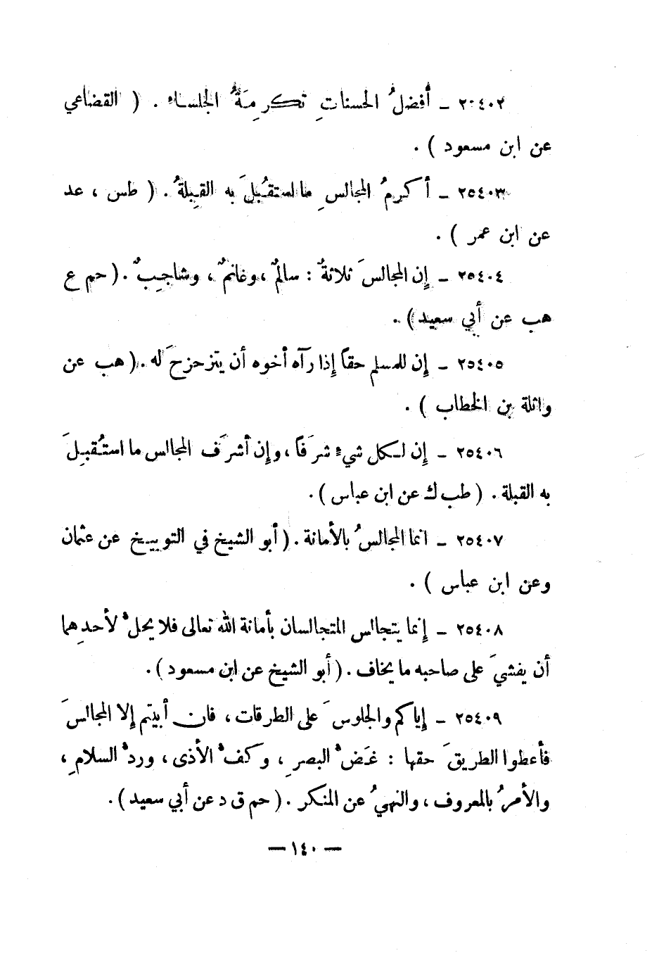 25403- "أكرم المجالس ما استقبل به القبلة". "طس، عد عن ابن عمر".