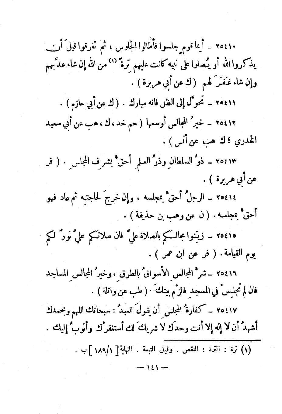 25410- "أيما قوم جلسوا فأطالوا الجلوس، ثم تفرقوا قبل أن يذكروا الله أو يصلوا على نبيه كانت عليهم ترة 1 من الله إن شاء عذبهم وإن شاء غفر لهم". "ك عن أبي هريرة".