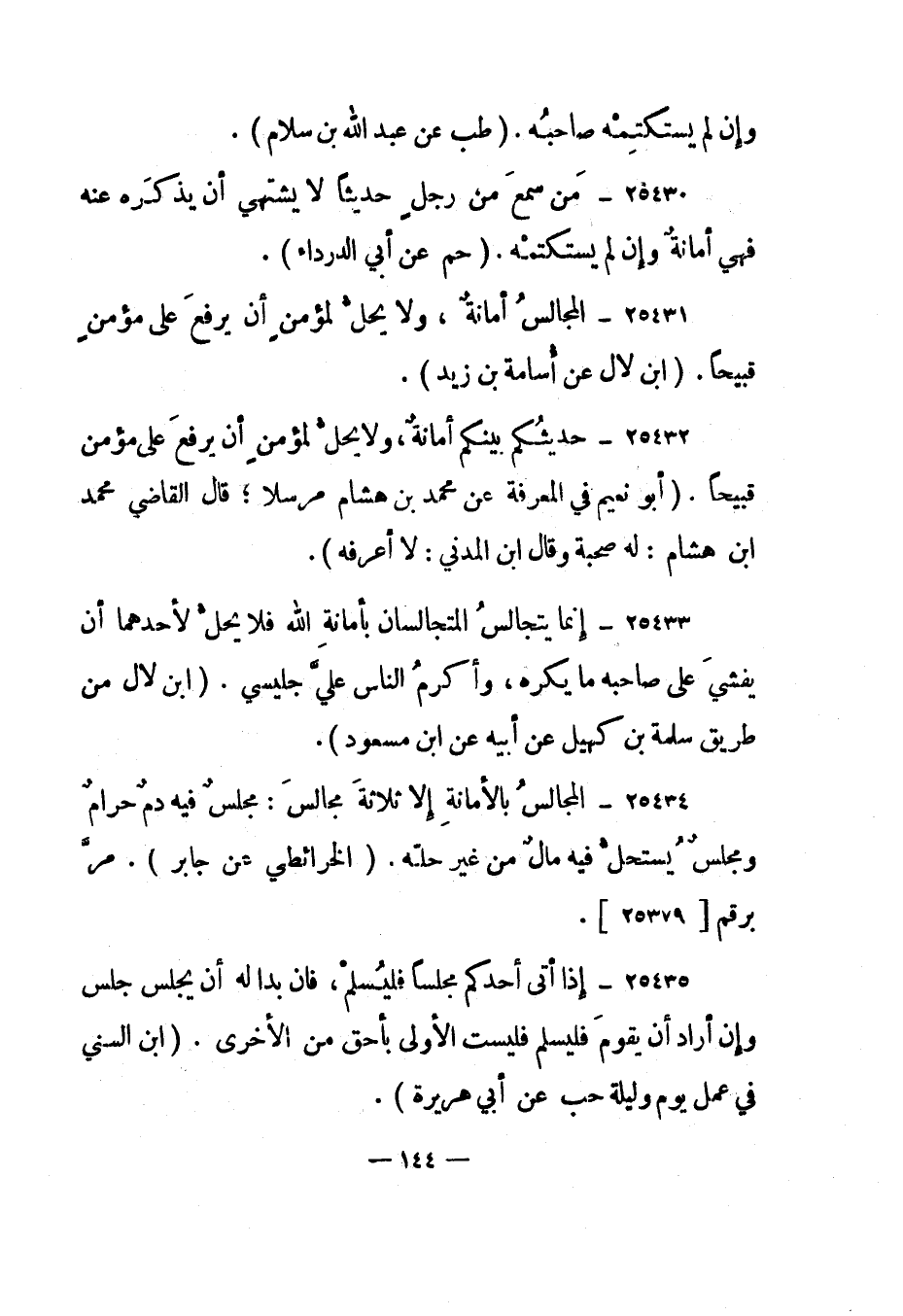 25431- "المجالس أمانة، ولا يحل لمؤمن أن يرفع على مؤمن قبيحا". "ابن لال عن أسامة بن زيد".