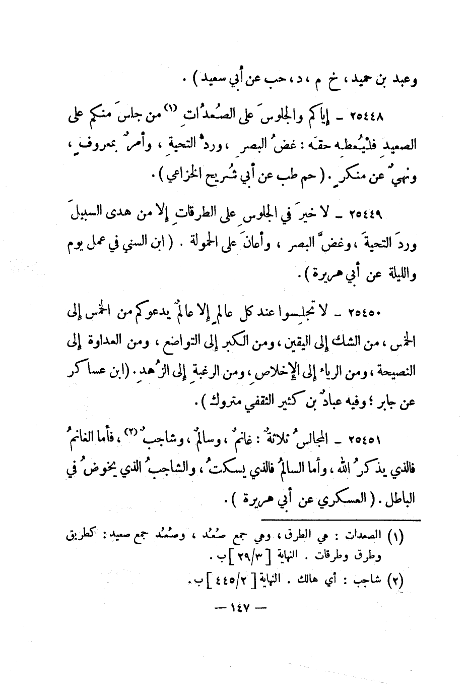 25449- "لا خير في الجلوس على الطرقات إلا من هدى السبيل ورد التحية، وغض البصر، وأعان على الحمولة". "ابن السني في عمل يوم والليلة عن أبي هريرة".