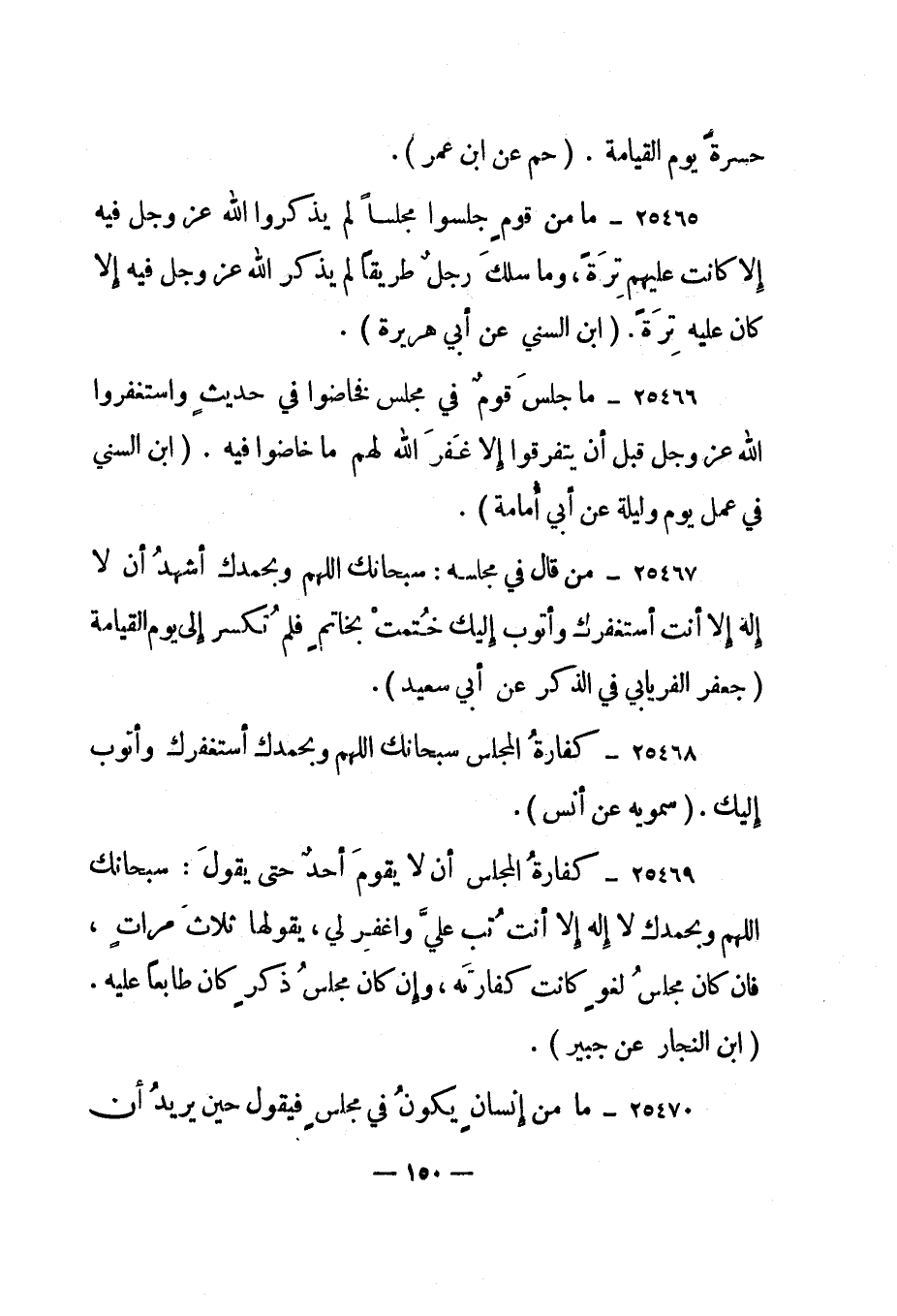 25466- "ما جلس قوم في مجلس فخاضوا في حديث واستغفروا الله عز وجل قبل أن يتفرقوا إلا غفر الله لهم ما خاضوا فيه". "ابن السني في عمل يوم وليلة عن أبي أمامة".