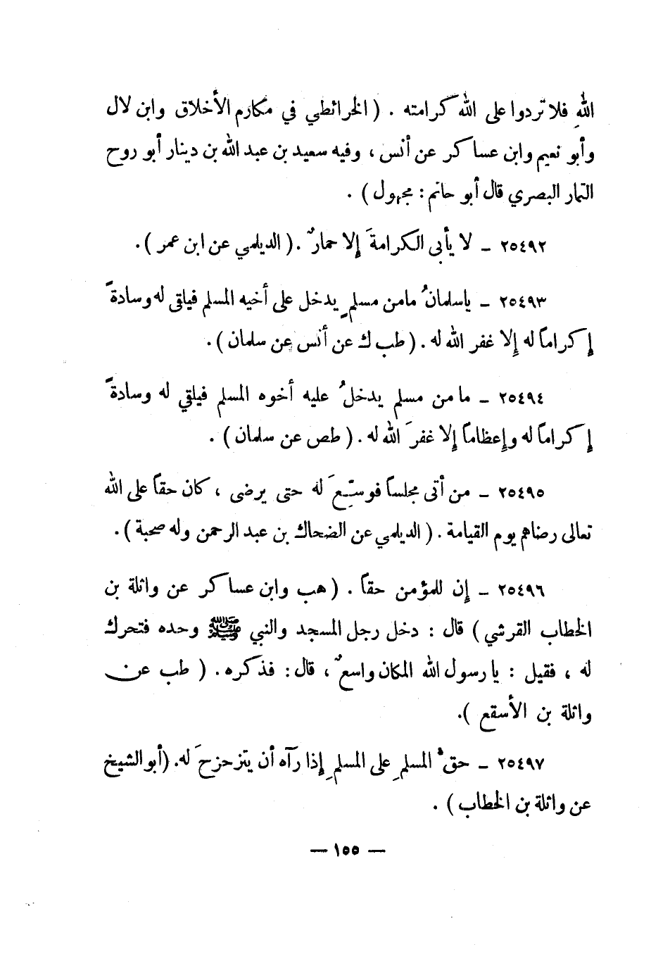 25494- "ما من مسلم يدخل عليه أخوه المسلم فيلقي له وسادة إكراما له وإعظاما إلا غفر الله له". "طص عن سلمان".