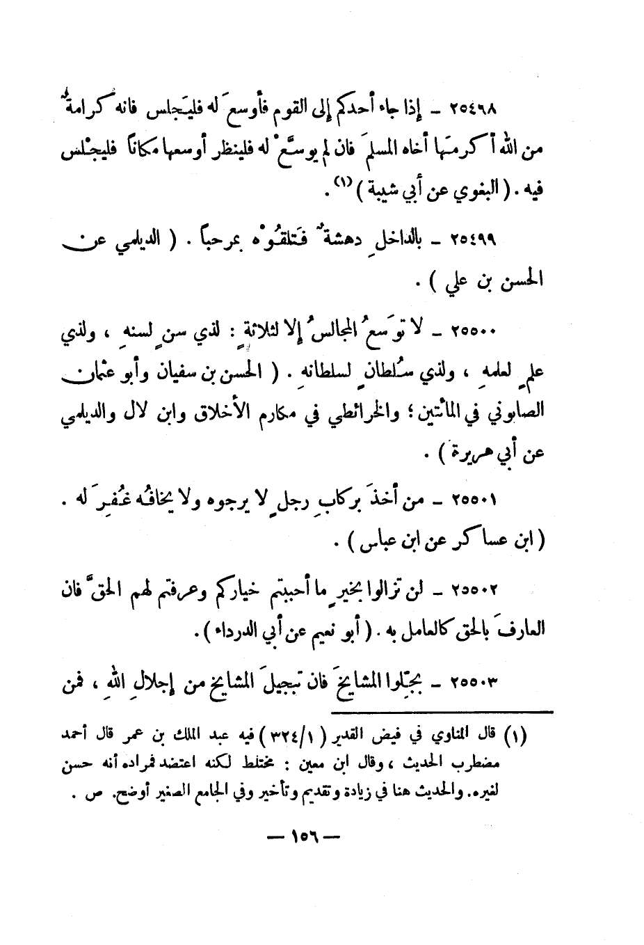 25500- "لا توسع المجالس إلا لثلاثة: لذي سن لسنه، ولذي علم لعلمه، ولذي سلطان لسلطانه". "الحسن بن سفيان وأبو عثمان الصابوني في المائتين؛ والخرائطي في مكارم الأخلاق وابن لال والديلمي عن أبي هريرة".