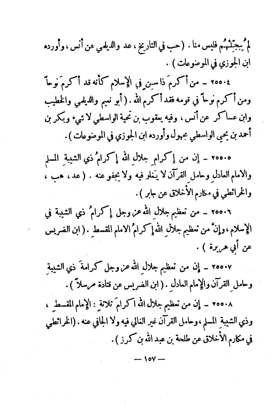 25505- "إن من إكرام جلال الله إكرام ذي الشيبة المسلم والإمام العادل وحامل القرآن لا يغلو فيه ولا يجفو عنه". "عد، هب، والخرائطي في مكارم الأخلاق عن جابر".