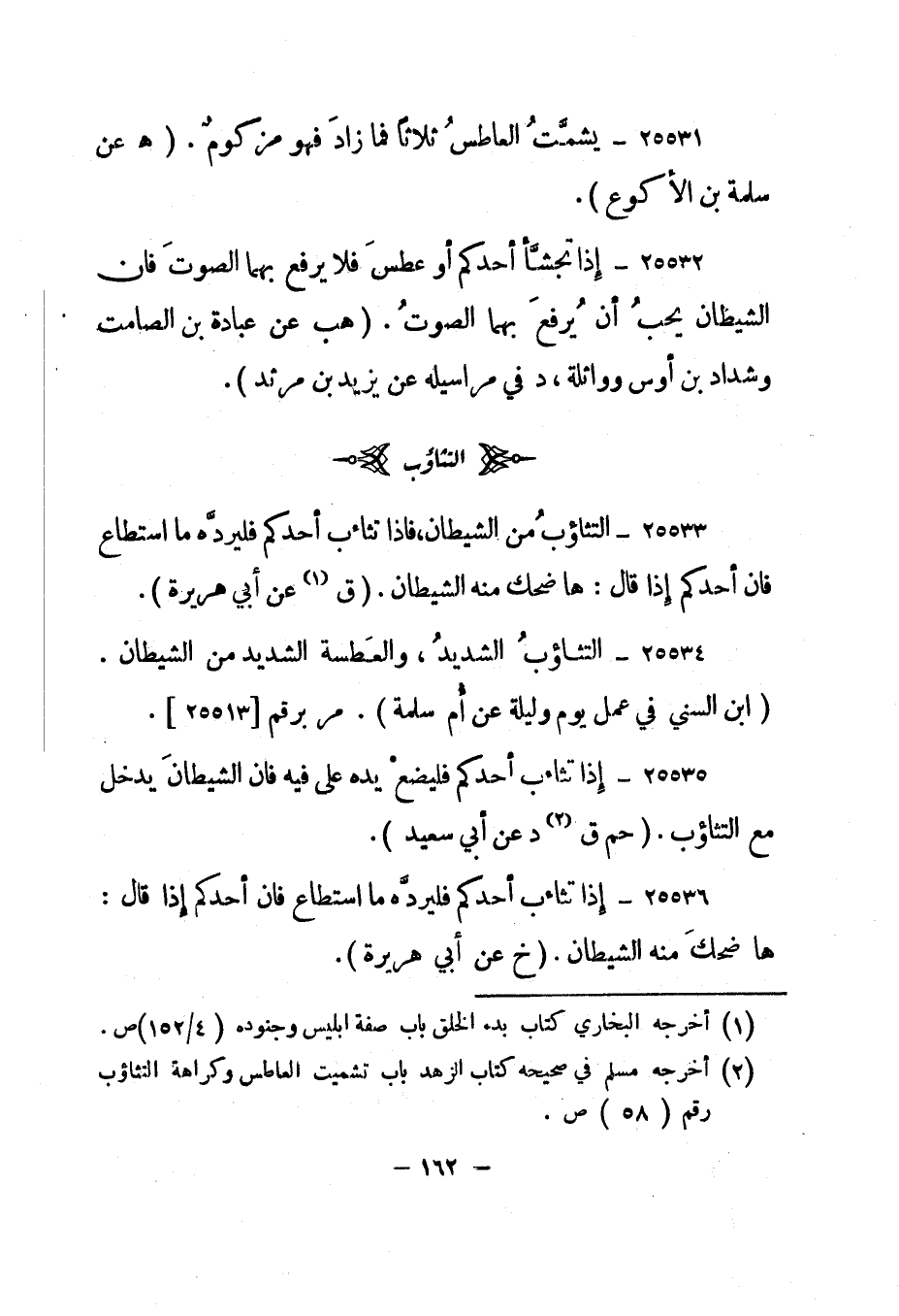 25534- "التثاؤب الشديد، والعطسة الشديد من الشيطان". "ابن السني في عمل يوم وليلة عن أم سلمة". مر برقم [25513] .
