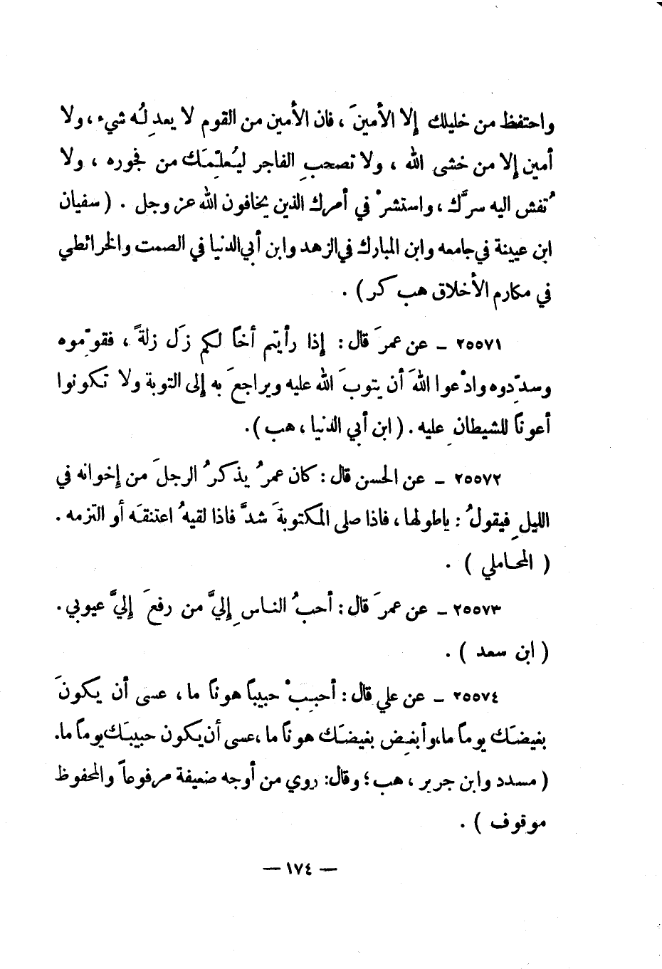 25574- عن علي قال: "أحبب حبيبا هونا ما، عسى أن يكون بغيضك يوما ما، وأبغض بغيضك هونا ما، عسى أن يكون حبيبك يوما ما". "مسدد وابن جرير، هب؛ وقال: روي من أوجه ضعيفة مرفوعا والمحفوظ موقوف".