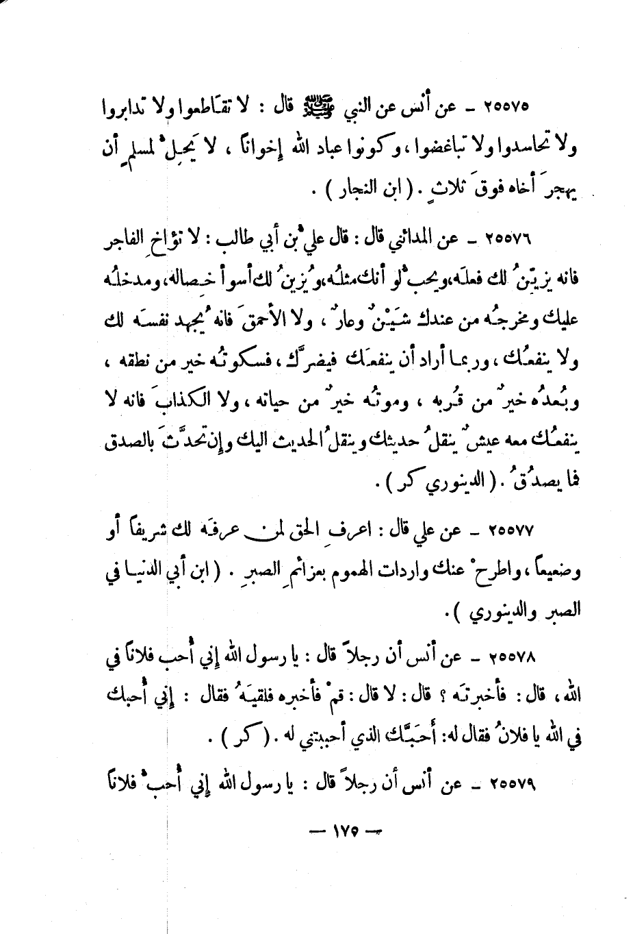 25575- عن أنس عن النبي صلى الله عليه وسلم قال: "لا تقاطعوا ولا تدابروا ولا تحاسدوا ولا تباغضوا، وكونوا عباد الله إخوانا، لا يحل لمسلم أن يهجر أخاه فوق ثلاث". "ابن النجار".