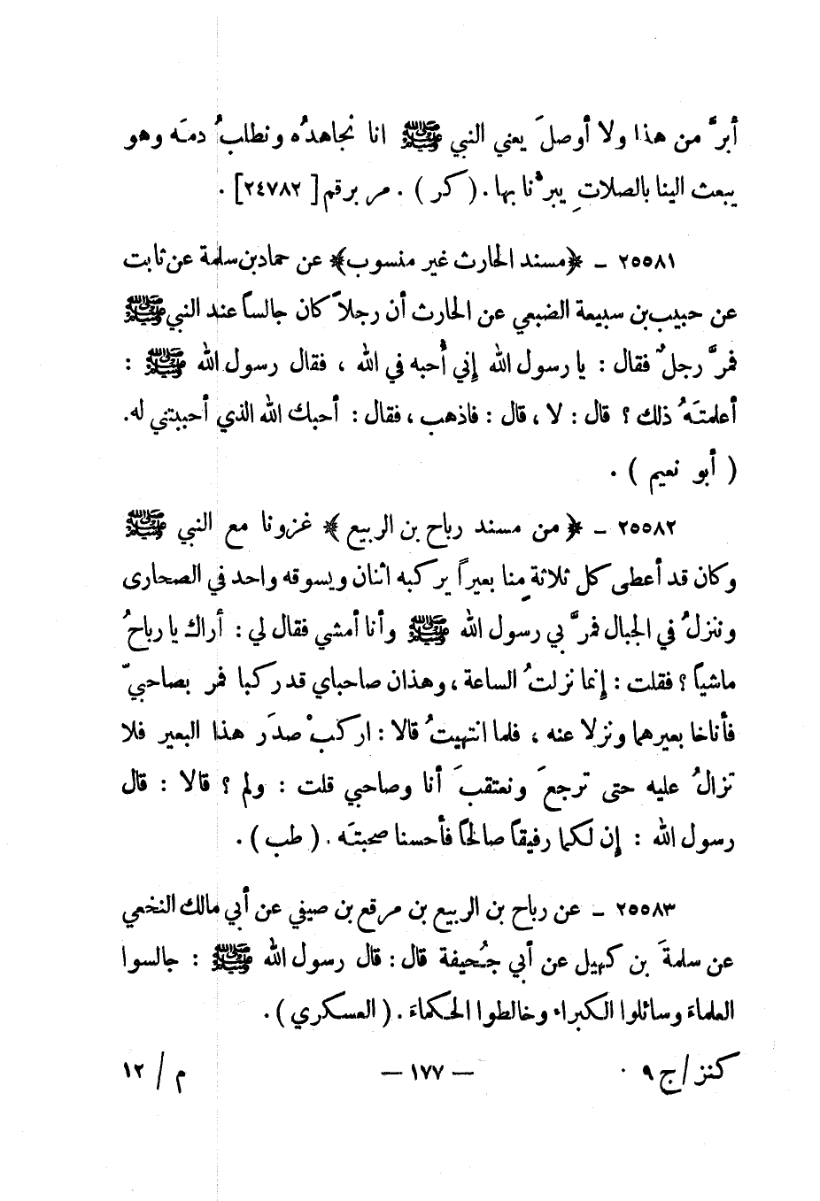 25582- "من مسند رباح بن الربيع" "غزونا مع النبي صلى الله عليه وسلم وكان قد أعطى كل ثلاثة منا بعيرا يركبه اثنان ويسوقه واحد في الصحارى وننزل في الجبال فمر بي رسول الله صلى الله عليه وسلم وأنا أمشي فقال لي: "أراك يا رباح ماشيا؟ " فقلت: إنما نزلت الساعة، وهذان صاحباي قد ركبا فمر بصاحبي فأناخا بعيرهما ونزلا عنه، فلما انتهيت قالا: اركب صدر هذا البعير فلا تزال عليه حتى ترجع ونعتقب أنا وصاحبي قلت: ولم؟ قالا: قال رسول الله: "إن لكما رفيقا صالحا فأحسنا صحبته". "طب".