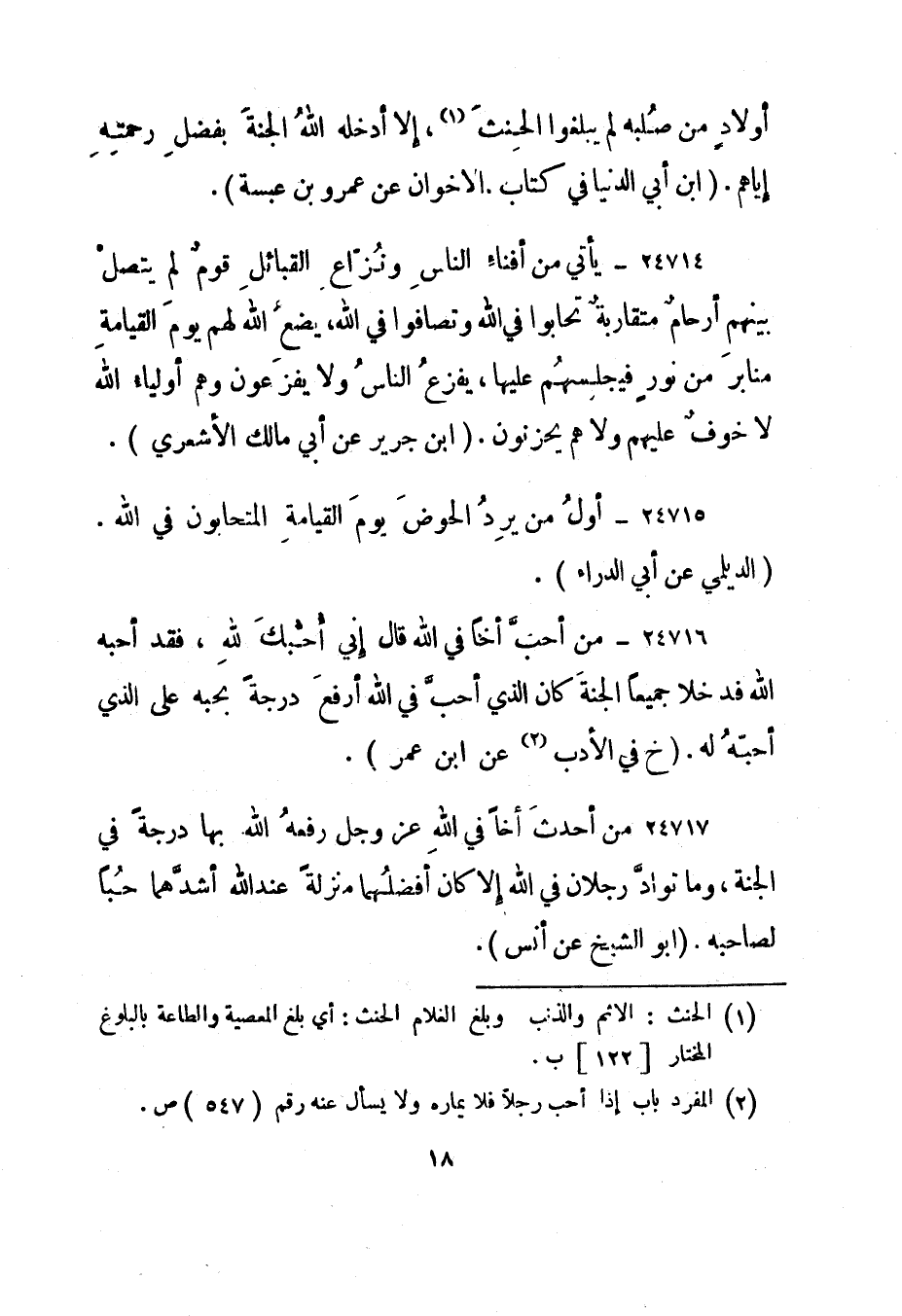 24714- "يأتي من أفناء الناس ونزاع القبائل قوم لم يتصل بينهم أرحام متقاربة تحابوا في الله وتصافوا في الله، يضع الله لهم يوم القيامة منابر من نور فيجلسهم عليها، يفزع الناس ولا يفزعون وهم أولياء الله لا خوف عليهم ولا هم يحزنون". "ابن جرير عن أبي مالك الأشعري".