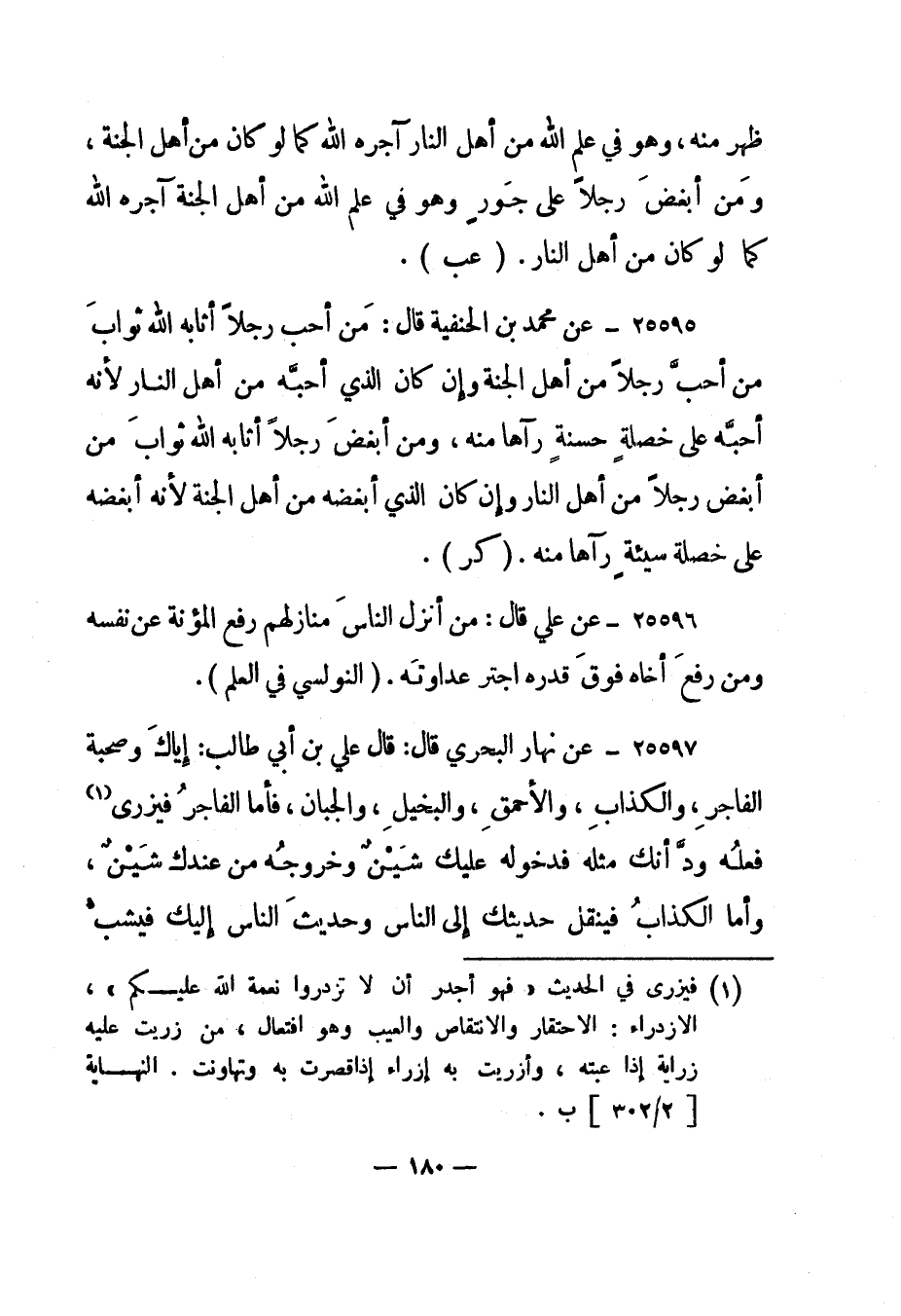 25595- عن محمد بن الحنفية قال: "من أحب رجلا أثابه الله ثواب من أحب رجلا من أهل الجنة وإن كان الذي أحبه من أهل النار لأنه أحبه على خصلة حسنة رآها منه، ومن أبغض رجلا أثابه الله ثواب من أبغض رجلا من أهل النار وإن كان الذي أبغضه من أهل الجنة لأنه أبغضه على خصلة سيئة رآها منه". "كر".
