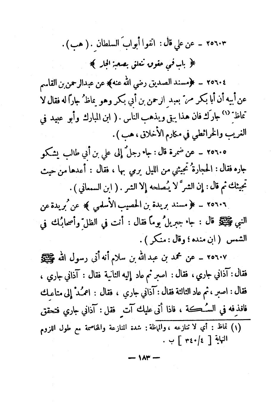 25604- "مسند الصديق رضي الله عنه" عن عبد الرحمن بن القاسم عن أبيه "أن أبا بكر مر بعبد الرحمن بن أبي بكر وهو يماظ جارا له فقال لا تماظ 1 جارك فإن هذا يبقى ويذهب الناس". "ابن المبارك وأبو عبيد في الغريب والخرائطي في مكارم الأخلاق، هب".
