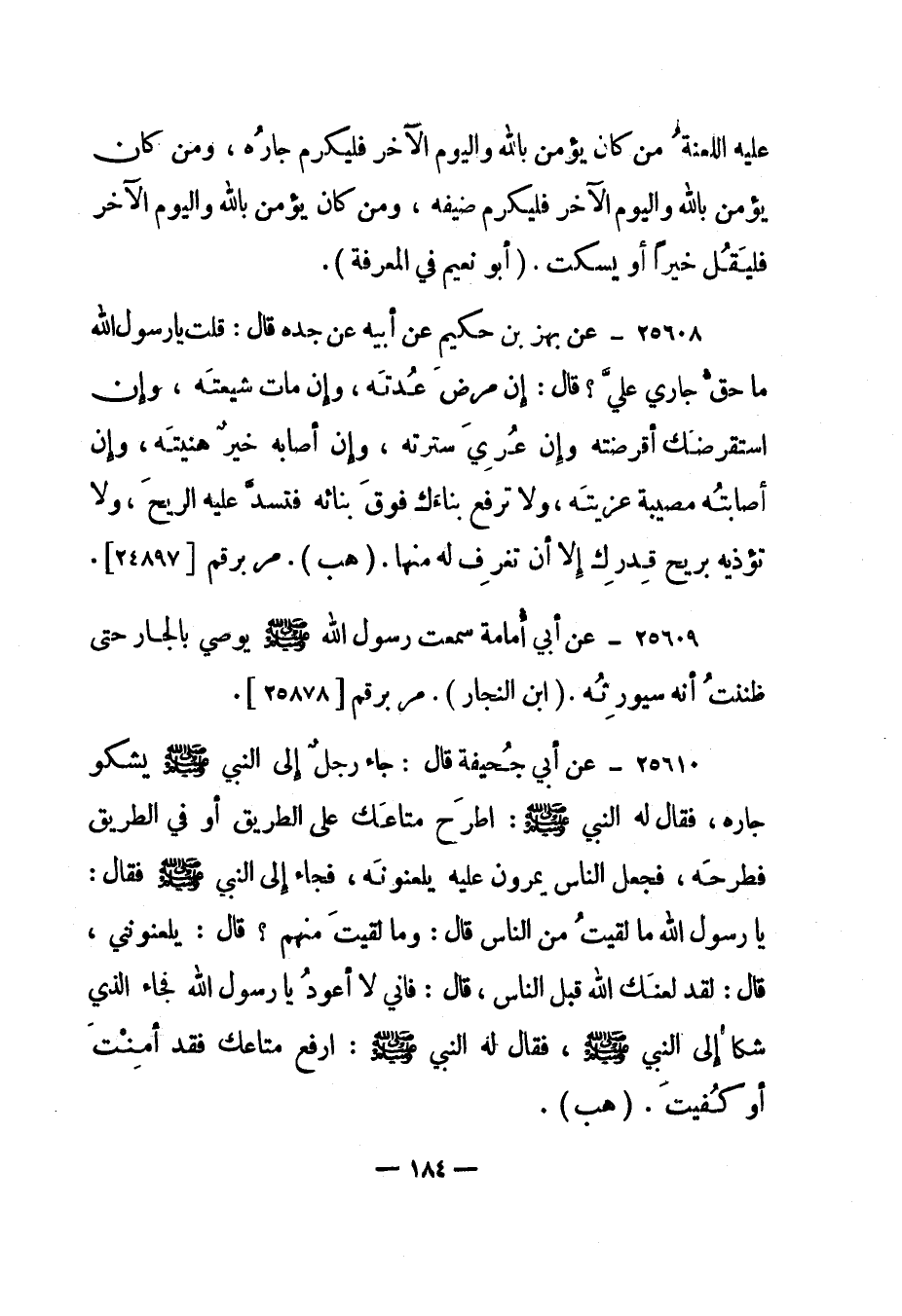 25609- عن أبي أمامة "سمعت رسول الله صلى الله عليه وسلم يوصي بالجار حتى ظننت أنه سيورثه". "ابن النجار". مر برقم [25878] .