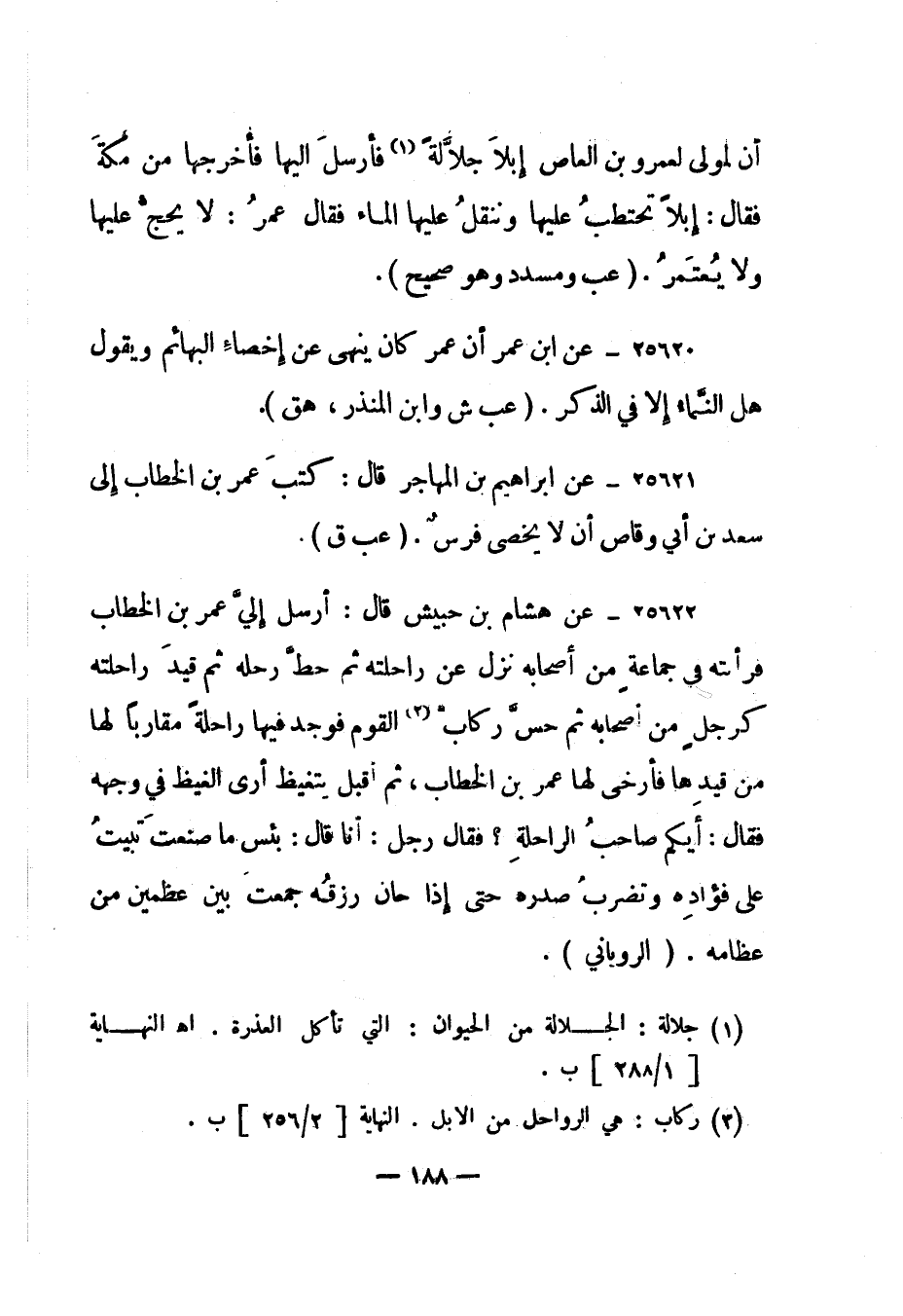 "أن لمولى لعمرو بن العاص إبلا جلالة 1 فأرسل إليها فأخرجها من مكة فقال: إبلا تحتطب عليها وننقل عليها الماء فقال عمر: لا يحج عليها ولا يعتمر". "عب ومسدد وهو صحيح".