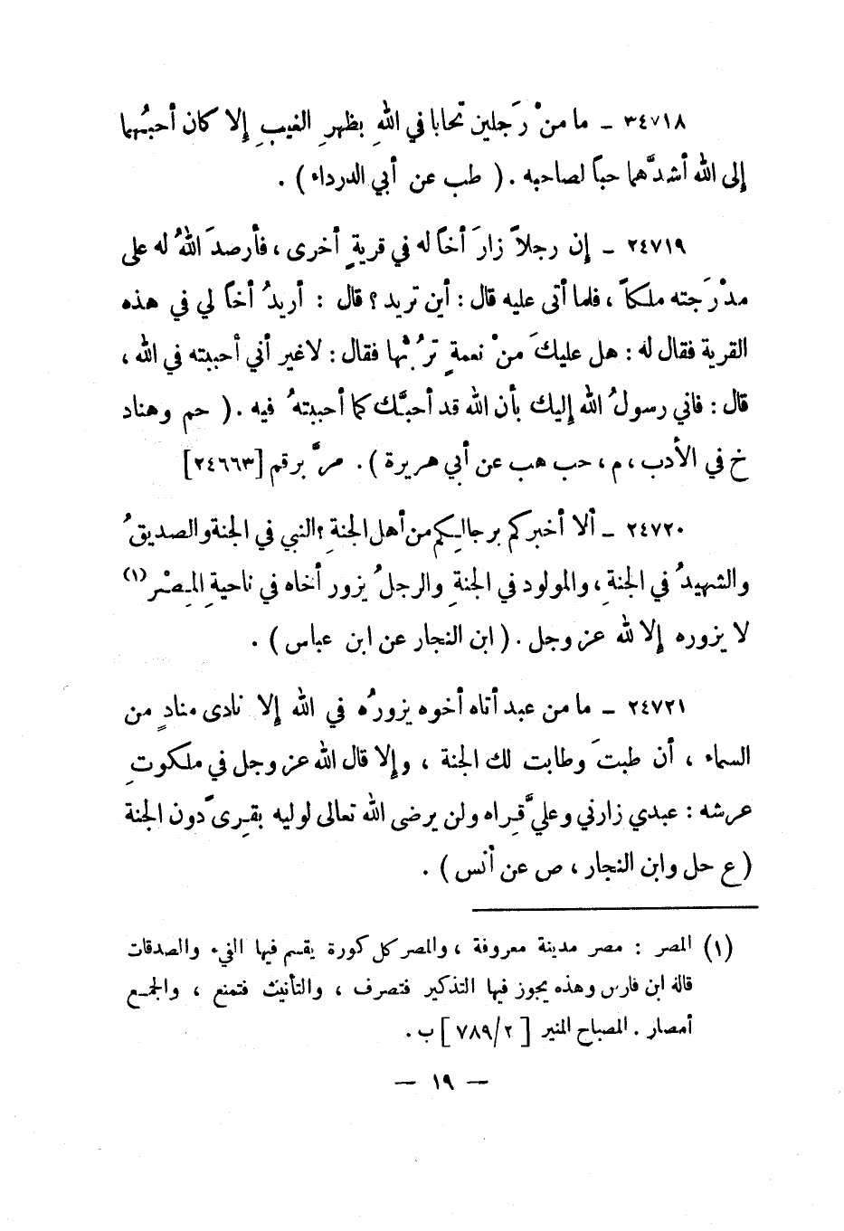 24720- "ألا أخبركم برجالكم من أهل الجنة؟ النبي في الجنة والصديق والشهيد في الجنة، والمولود في الجنة والرجل يزور أخاه في ناحية المصر 1 لا يزوره إلا لله عز وجل". "ابن النجار عن ابن عباس".