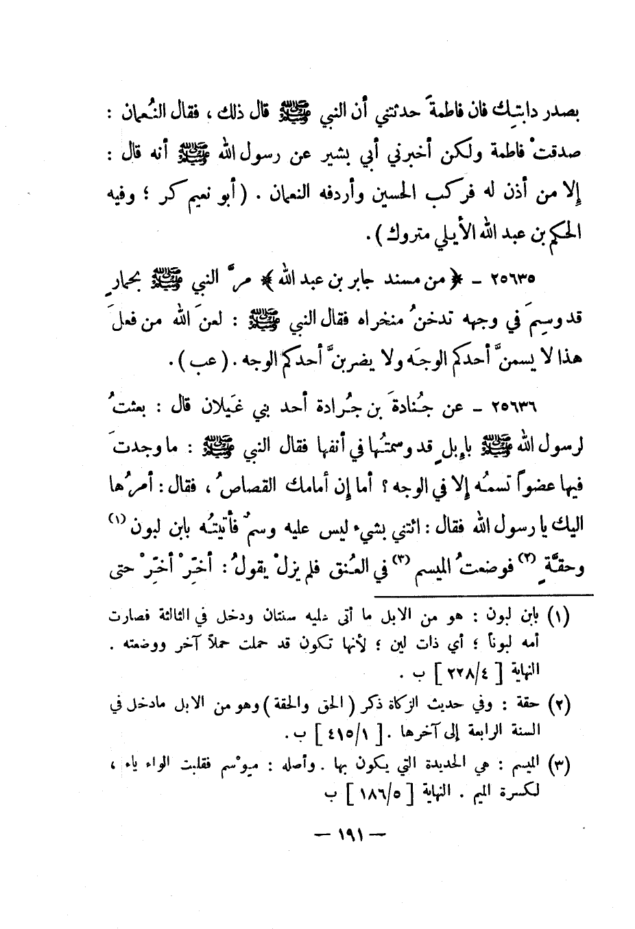 25636- عن جنادة بن جرادة أحد بني غيلان قال: "بعثت لرسول الله صلى الله عليه وسلم بإبل قد وسمتها في أنفها فقال النبي صلى الله عليه وسلم: "ما وجدت فيها عضوا تسمه إلا في الوجه؟ أما إن أمامك القصاص"، فقال: أمرها إليك يا رسول الله فقال: "ائتني بشيء ليس عليه وسم" فأتيته بابن لبون 1 وحقة 2 فوضعت الميسم 3 في العنق فلم يزل يقول: "أخر أخر" حتى