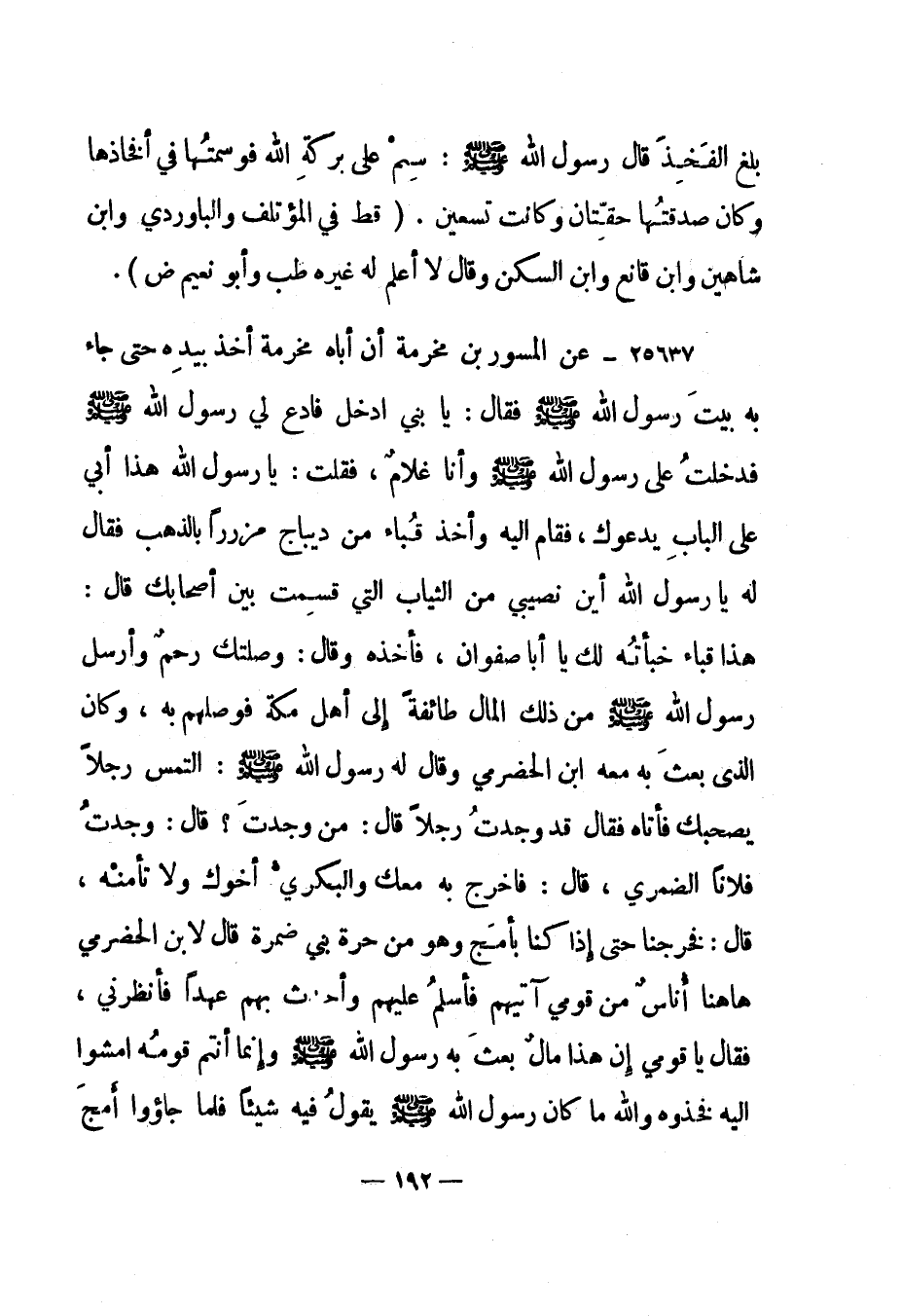 25637- عن المسور بن مخرمة أن أباه مخرمة أخذ بيده حتى جاء به بيت رسول الله صلى الله عليه وسلم فقال: "يا بني ادخل فادع لي رسول الله صلى الله عليه وسلم فدخلت على رسول الله صلى الله عليه وسلم وأنا غلام، فقلت: يا رسول الله هذا أبي على الباب يدعوك، فقام إليه وأخذ قباء من ديباج مزررا بالذهب فقال له يا رسول الله أين نصيبي من الثياب التي قسمت بين أصحابك قال: "هذا قباء خبأته لك يا أبا صفوان"، فأخذه وقال: وصلتك رحم وأرسل رسول الله صلى الله عليه وسلم من ذلك المال طائفة إلى أهل مكة فوصلهم به، وكان الذي بعث به معه ابن الحضرمي وقال له رسول الله صلى الله عليه وسلم: "التمس رجلا يصحبك" فأتاه فقال قد وجدت رجلا قال: "من وجدت؟ " قال: وجدت فلانا الضمري، قال: "فاخرج به معك والبكري أخوك ولا تأمنه"، قال: فخرجنا حتى إذا كنا بأمج وهو من حرة بني ضمرة قال لابن الحضرمي ها هنا أناس من قومي آتيهم فأسلم عليهم وأحدث بهم عهدا فأنظرني، فقال يا قومي إن هذا مال بعث به رسول الله صلى الله عليه وسلم وإنما أنتم قومه امشوا إليه فخذوه والله ما كان رسول الله صلى الله عليه وسلم يقول فيه شيئا فلما جاؤوا أمج