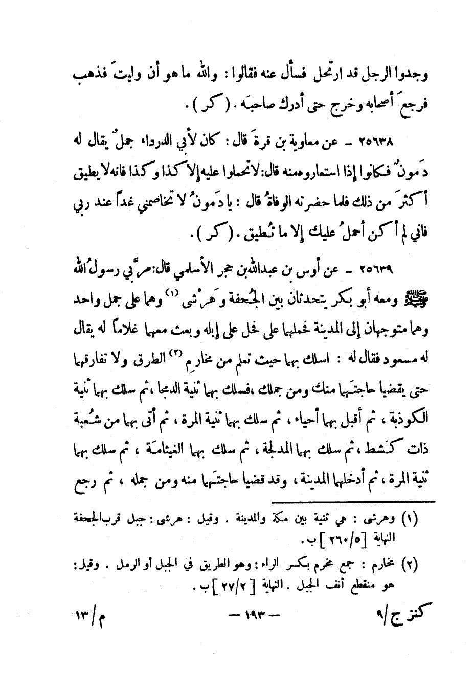 25639- عن أوس بن عبد الله بن حجر الأسلمي قال: مر بي رسول الله صلى الله عليه وسلم ومعه أبو بكر يتحدثان بين الجحفة وهرشى 1 وهما على جمل واحد وهما متوجهان إلى المدينة فحملهما على فحل على إبله وبعث معهما غلاما له يقال له مسعود فقال له: اسلك بهما حيث تعلم من مخارم 2 الطرق ولا تفارقهما حتى يقضيا حاجتهما منك ومن جملك، فسلك بهما ثنية الدمجا، ثم سلك بهما ثنية الكوذبة، ثم أقبل بهما أحياء، ثم سلك بهما ثنية المرة، ثم أتى بهما من شعبة ذات كشط، ثم سلك بهما المدلجة، ثم سلك بهما الغيثامة، ثم سلك بهما ثنية المرة، ثم أدخلهما المدينة، وقد قضيا حاجتهما منه ومن جمله، ثم رجع