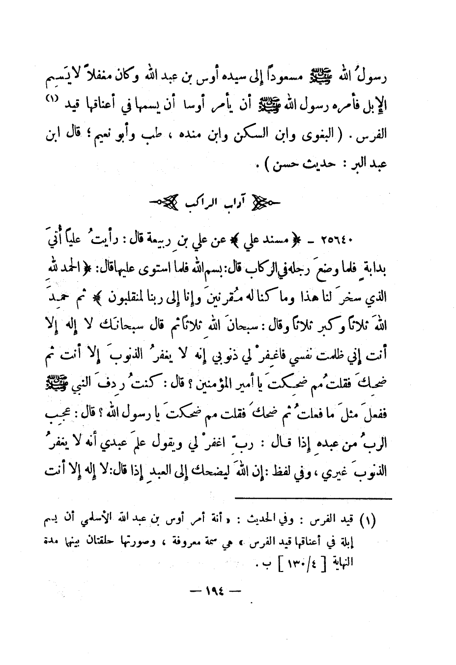 25640- "مسند علي" عن علي بن ربيعة قال: "رأيت عليا أتي بدابة فلما وضع رجله في الركاب قال: بسم الله فلما استوى عليها قال: "الحمد لله الذي سخر لنا هذا وما كنا له مقرنين وإنا إلى ربنا لمنقلبون" ثم حمد الله ثلاثا وكبر ثلاثا وقال: سبحان الله ثلاثا ثم قال سبحانك لا إله إلا أنت إني ظلمت نفسي فاغفر لي ذنوبي إنه لا يغفر الذنوب إلا أنت ثم ضحك فقلت مم ضحكت يا أمير المؤمنين؟ قال: كنت ردف النبي صلى الله عليه وسلم ففعل مثل ما فعلت ثم ضحك فقلت مم ضحكت يا رسول الله؟ قال: "عجب الرب من عبده إذا قال: رب اغفر لي ويقول علم عبدي أنه لا يغفر الذنوب غيري، وفي لفظ: إن الله ليضحك إلى العبد إذا قال: لا إله إلا أنت