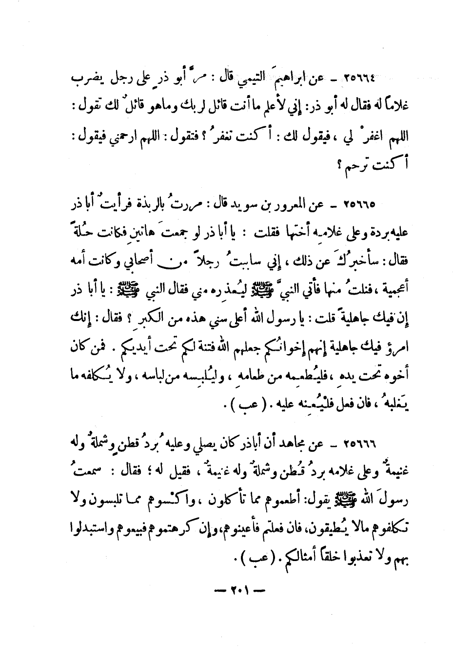 25665-عن المعرور بن سويد قال: "مررت بالربذة فرأيت أبا ذر عليه بردة وعلى غلامه أختها فقلت: يا أبا ذر لو جمعت هاتين فكانت حلة فقال: سأخبرك عن ذلك، إني ساببت رجلا من أصحابي وكانت أمه أعجمية، فنلت منها فأتي النبي صلى الله عليه وسلم ليعذره مني فقال النبي صلى الله عليه وسلم: "يا أبا ذر إن فيك جاهلية" قلت: يا رسول الله أعلى سني هذه من الكبر؟ فقال: "إنك امرؤ فيك جاهلية إنهم إخوانكم جعلهم الله فتنة لكم تحت أيديكم، فمن كان أخوه تحت يده، فليطعمه من طعامه، وليلبسه من لباسه، ولا يكلفه ما يغلبه، فإن فعل فليعنه عليه". "عب".