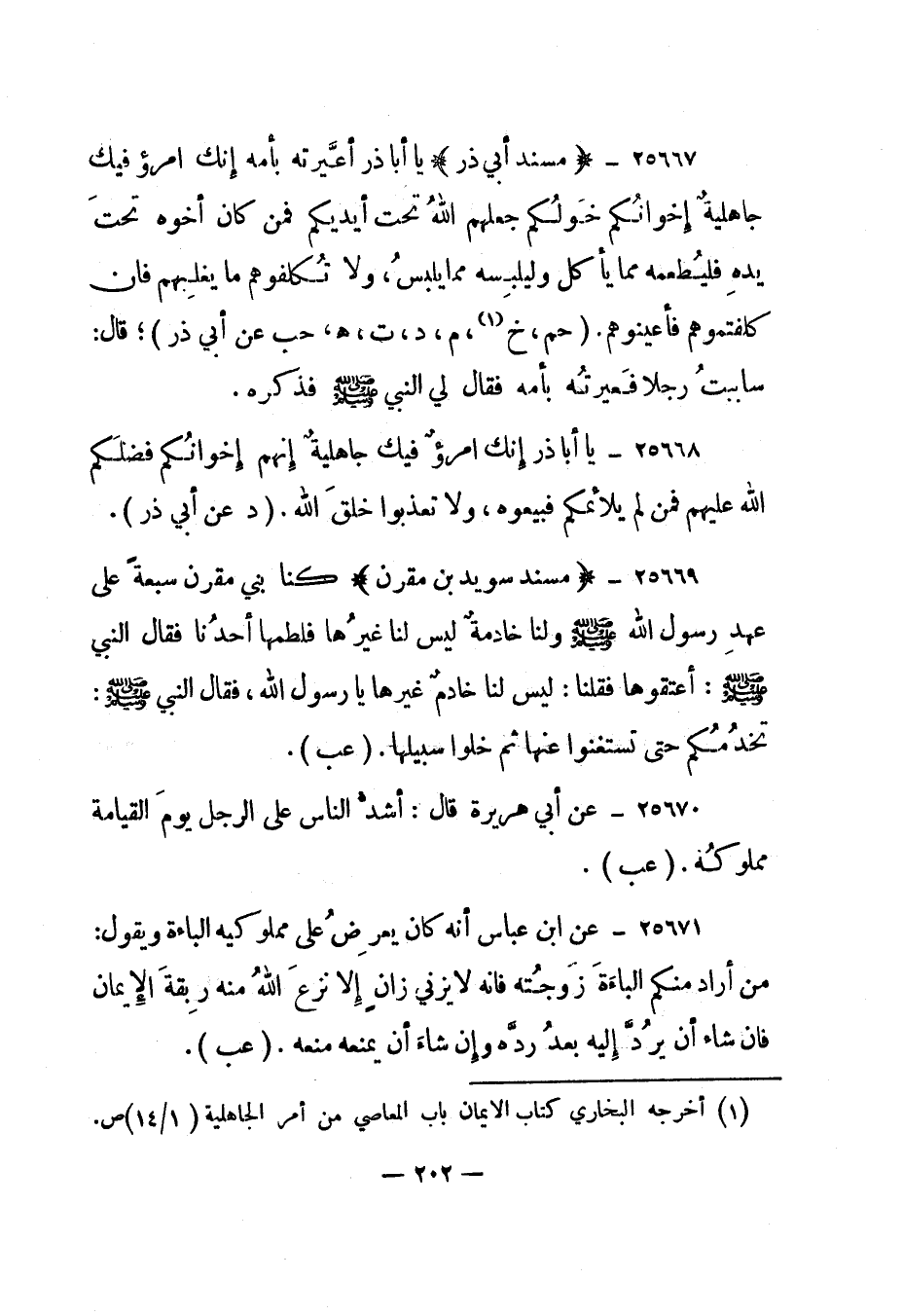 25667- "مسند أبي ذر" "يا أبا ذر أعيرته بأمه إنك امرؤ فيك جاهلية إخوانكم خولكم جعلهم الله تحت أيديكم فمن كان أخوه تحت يده فليطعمه مما يأكل وليلبسه مما يلبس، ولا تكلفوهم ما يغلبهم فإن كلفتموهم فأعينوهم". "حم، خ 1، م، د، ت، هـ، حب عن أبي ذر"؛ قال: ساببت رجلا فعيرته بأمه فقال لي النبي صلى الله عليه وسلم فذكره".