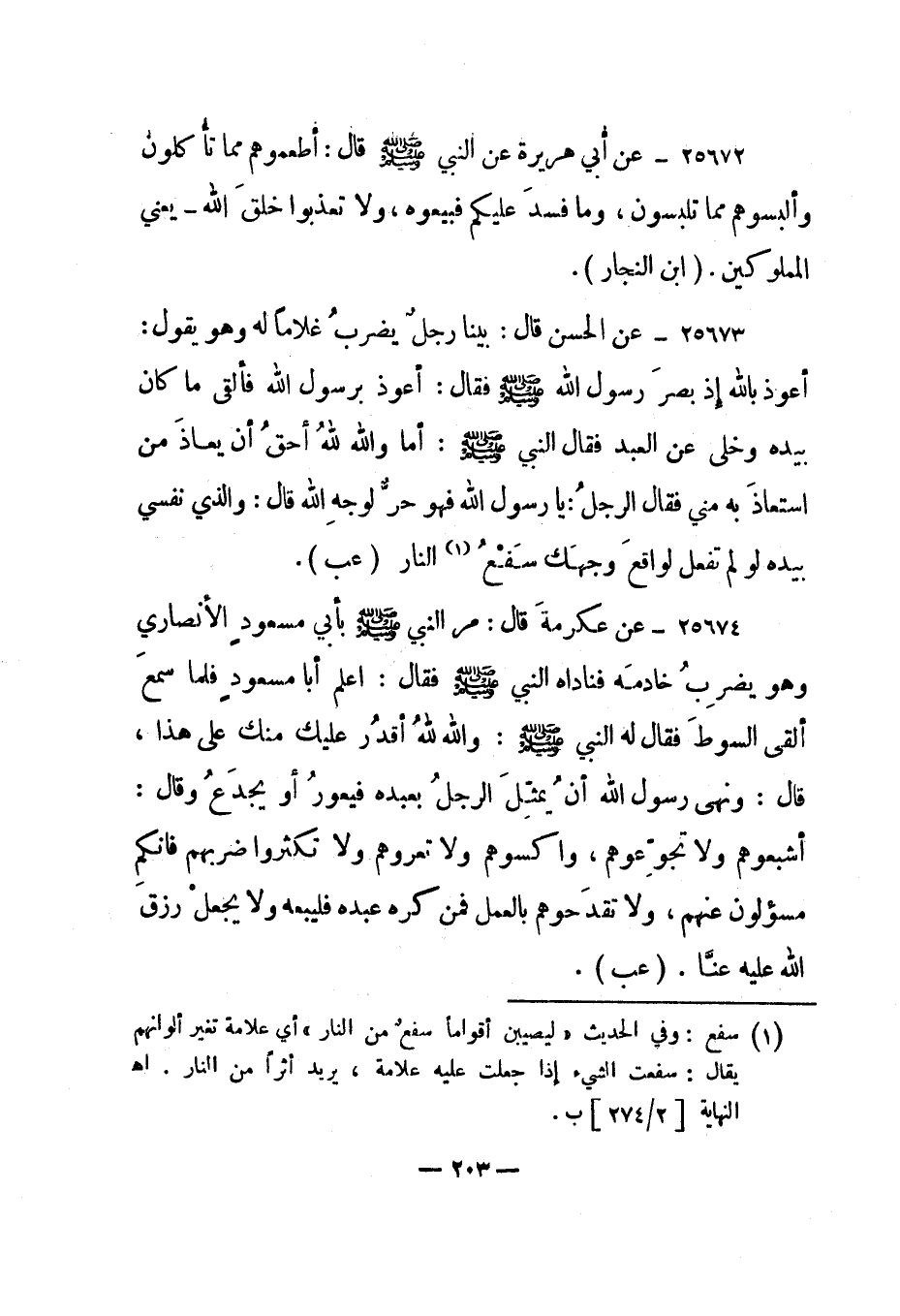 25673- عن الحسن قال: "بينا رجل يضرب غلاما له وهو يقول: أعوذ بالله إذ بصر رسول الله صلى الله عليه وسلم فقال: أعوذ برسول الله فألقى ما كان بيده وخلى عن العبد فقال النبي صلى الله عليه وسلم: "أما والله لله أحق أن يعاذ من استعاذ به مني" فقال الرجل: يا رسول الله فهو حر لوجه الله قال: "والذي نفسي بيده لو لم تفعل لواقع وجهك سفع 1 النار". "عب".