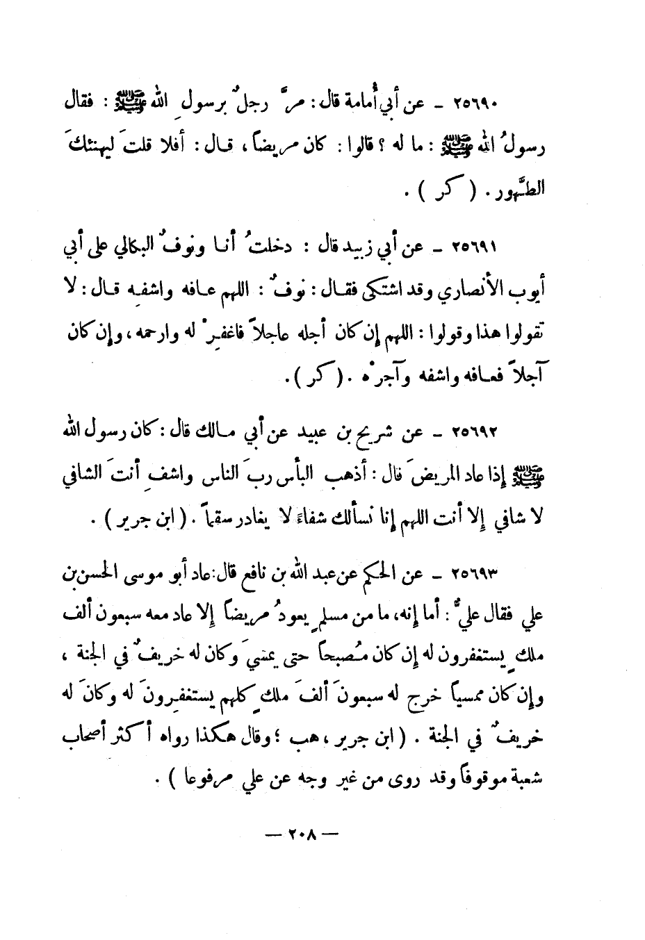 25693-عن الحكم عن عبد الله بن نافع قال: "عاد أبو موسى الحسن بن علي فقال علي: أما إنه، ما من مسلم يعود مريضا إلا عاد معه سبعون ألف ملك يستغفرون له إن كان مصبحا حتى يمسي وكان له خريف في الجنة، وإن كان ممسيا خرج له سبعون ألف ملك كلهم يستغفرون له وكان له خريف في الجنة". "ابن جرير، هب؛ وقال هكذا رواه أكثر أصحاب شعبة موقوفا وقد روى من غير وجه عن علي مرفوعا".