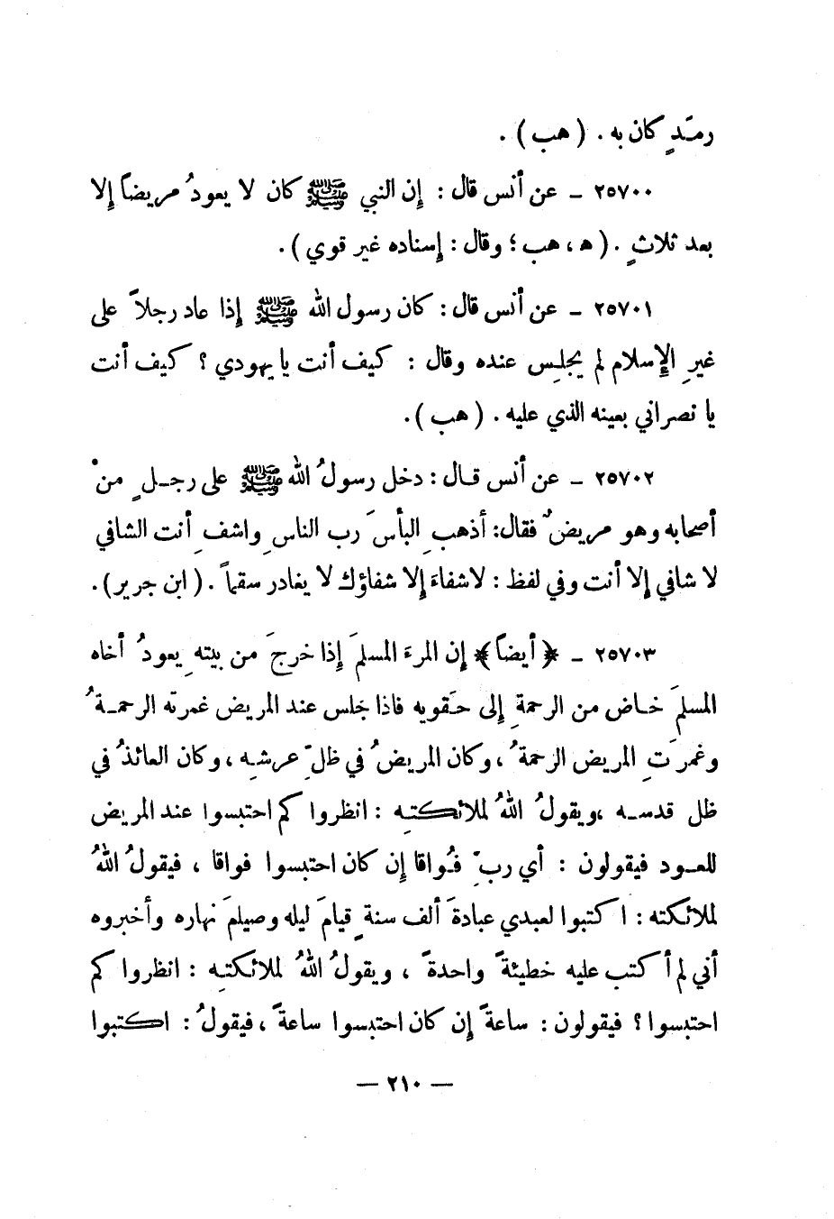 25701- عن أنس قال: "كان رسول الله صلى الله عليه وسلم إذا عاد رجلا على غير الإسلام لم يجلس عنده وقال: "كيف أنت يا يهودي؟ كيف أنت يا نصراني بعينه الذي عليه". "هب".