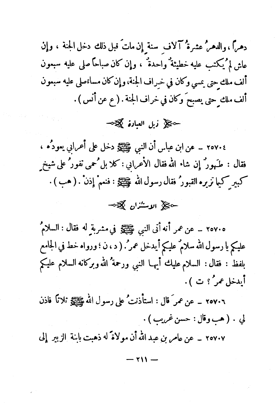 25705- عن عمر أنه "أتى النبي صلى الله عليه وسلم في مشربة له فقال: السلام عليكم يا رسول الله سلام عليكم أيدخل عمر". "د، ن؛ ورواه خط في الجامع بلفظ: فقال: السلام عليك أيها النبي ورحمة الله وبركاته السلام عليكم أيدخل عمر؟ ت".