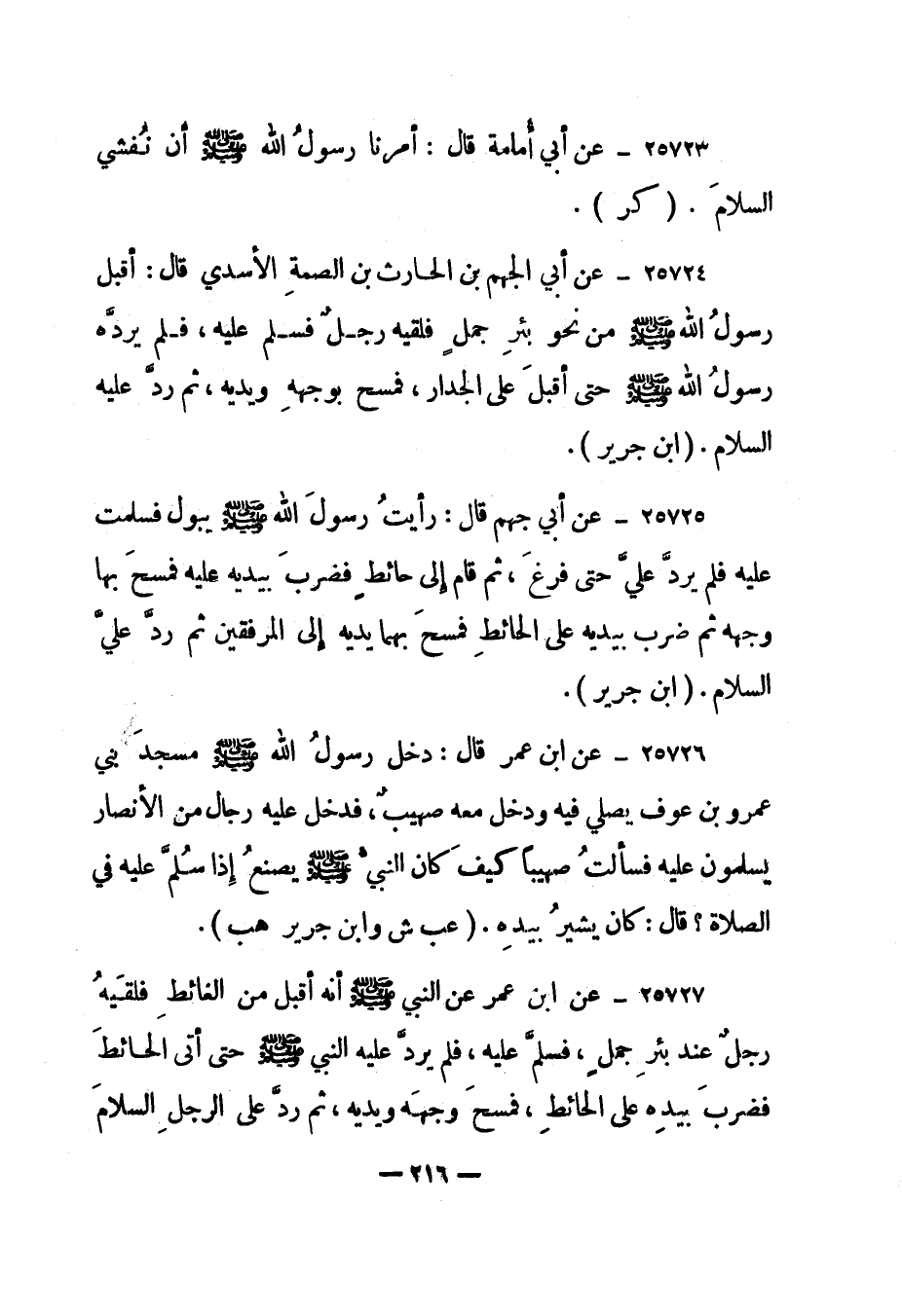 25725- عن أبي جهم قال: "رأيت رسول الله صلى الله عليه وسلم يبول فسلمت عليه فلم يرد علي حتى فرغ، ثم قام إلى حائط فضرب بيديه عليه فمسح بها وجهه ثم ضرب بيديه على الحائط فمسح بهما يديه إلى المرفقين ثم رد علي السلام". "ابن جرير".