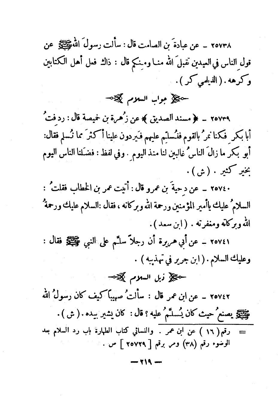 25740- عن دحية بن عمرو قال: "أتيت عمر بن الخطاب فقلت: السلام عليك يا أمير المؤمنين ورحمة الله وبركاته، فقال: السلام عليك ورحمة الله وبركاته ومغفرته". "ابن سعد".