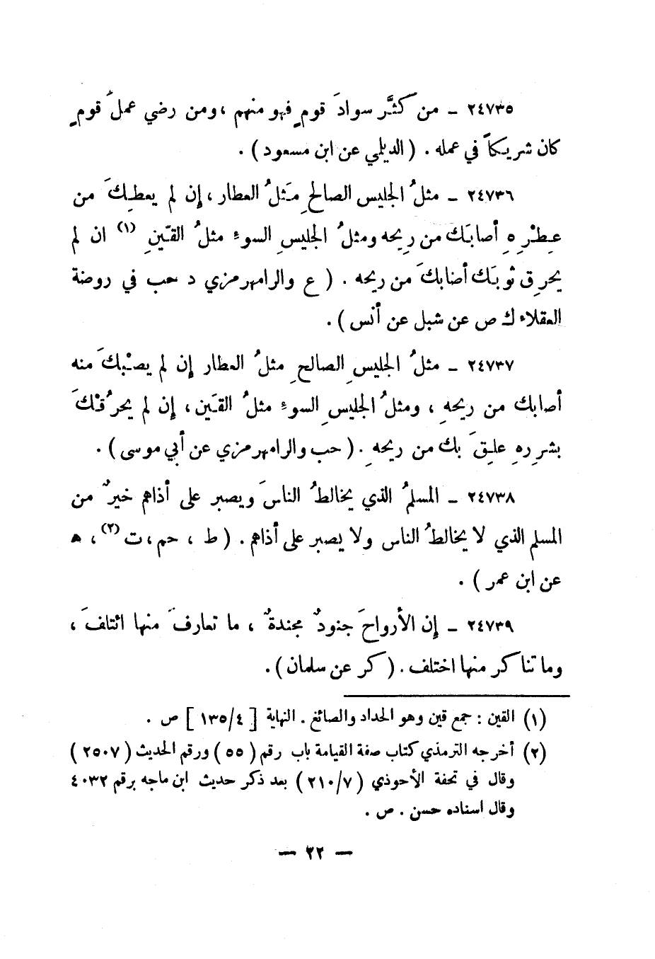 24737- "مثل الجليس الصالح مثل العطار إن لم يصبك منه أصابك من ريحه، ومثل الجليس السوء مثل القين، إن لم يحرقك بشرره علق بك من ريحه". "حب والرامهرمزي عن أبي موسى".