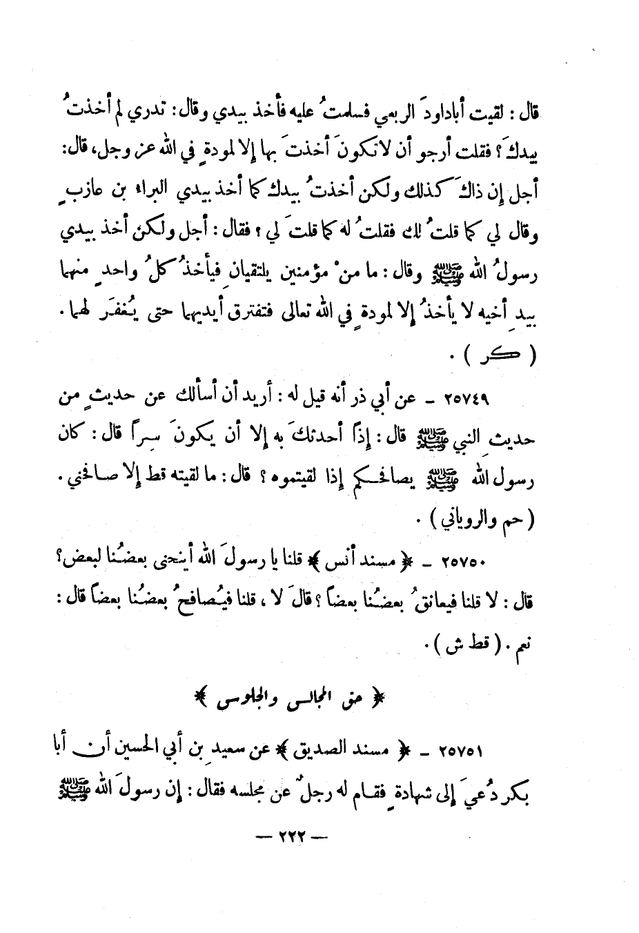 25749- عن أبي ذر أنه قيل له: أريد أن أسألك عن حديث من حديث النبي صلى الله عليه وسلم قال: "إذا أحدثك به إلا أن يكون سرا قال: كان رسول الله صلى الله عليه وسلم يصافحكم إذا لقيتموه؟ قال: ما لقيته قط إلا صافحني". "حم والروياني".