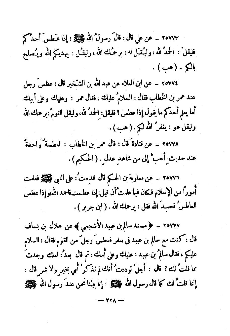 25774- عن ابن العلاء عن عبد الله بن الشخير قال: "عطس رجل عند عمر بن الخطاب فقال: السلام عليك، فقال عمر: وعليك وعلى أبيك أما يعلم أحدكم ما يقول إذا عطس؟ فليقل: الحمد لله، وليقل القوم: يرحمك الله وليقل هو: يغفر الله لكم". "هب".