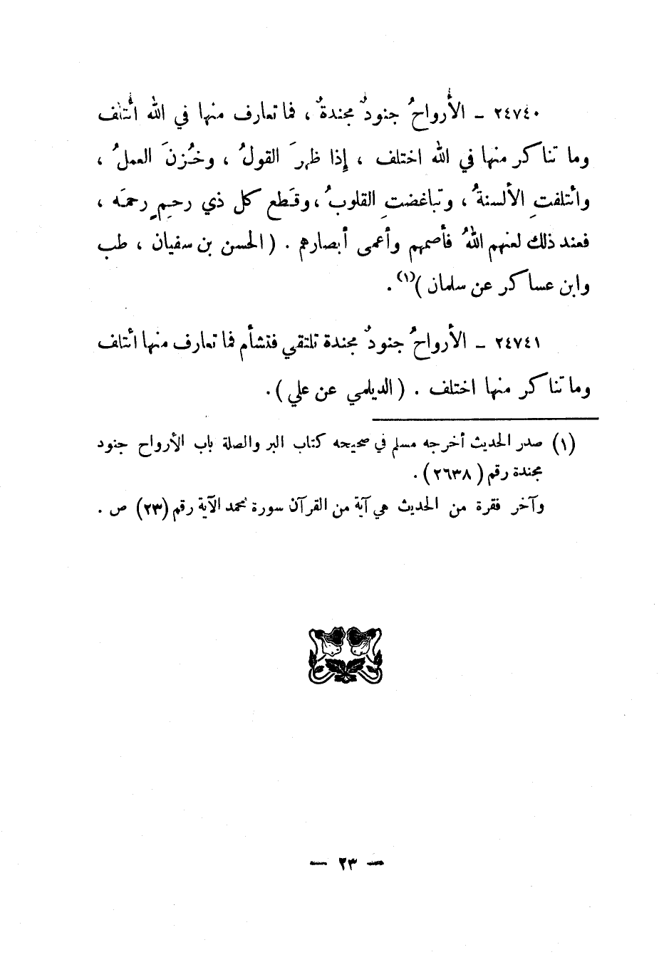 24741- "الأرواح جنود مجندة تلتقي فتشأم فما تعارف منها ائتلف وما تناكر منها اختلف". "الديلمي عن علي".
