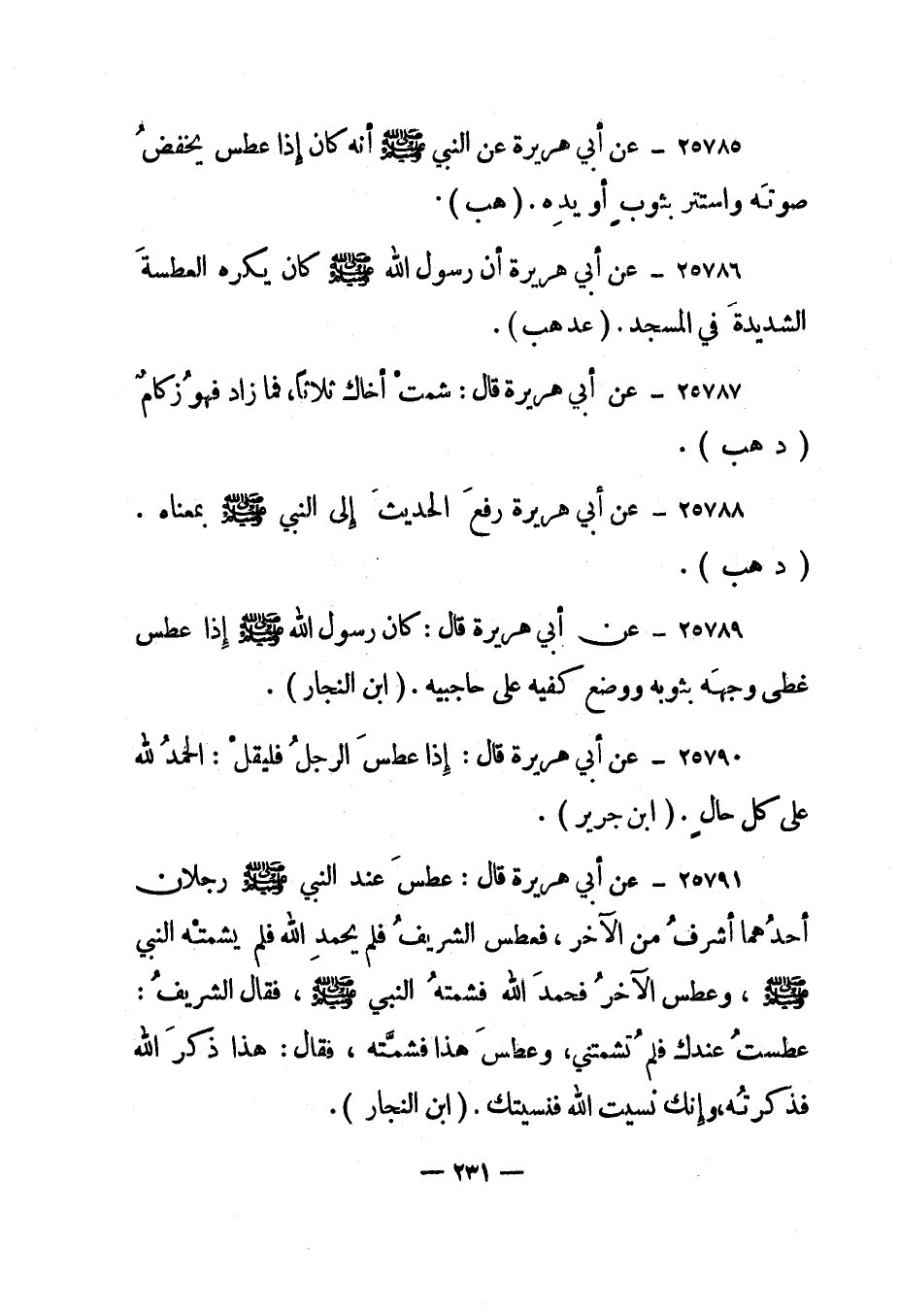 25790 - عن أبي هريرة قال: "إذا عطس الرجل فليقل: الحمد لله على كل حال". "ابن جرير".
