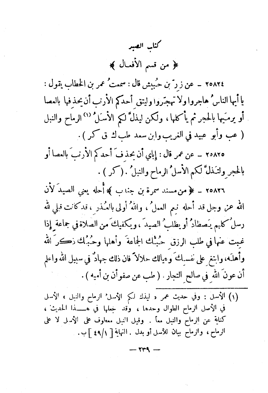 25824- عن زر بن حبيش قال: سمعت عمر بن الخطاب يقول: يا أيها الناس هاجروا ولا تهجروا وليتق أحدكم الأرنب أن يحذفها بالعصا أو يرميها بالحجر ثم يأكلها، ولكن ليذل لكم الأسل 1 الرماح والنبل."عب وأبو عبيد في الغريب وابن سعد طب ك ق كر".