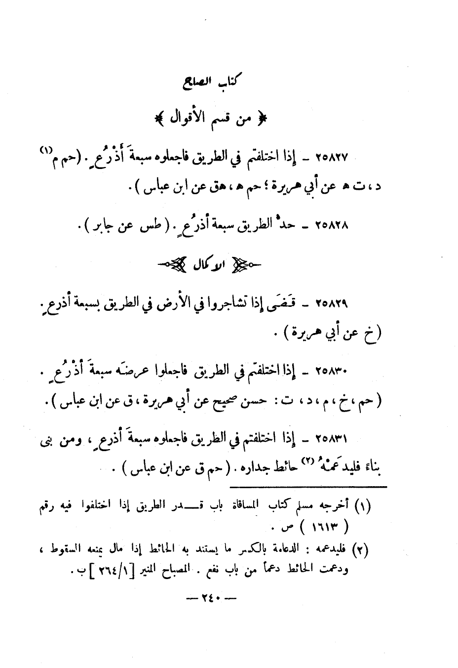 25830- "إذا اختلفتم في الطريق فاجعلوا عرضه سبعة أذرع". "حم، خ، م، د، ت: حسن صحيح عن أبي هريرة، ق عن ابن عباس".