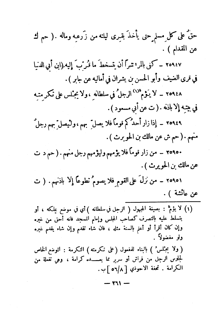 25948- "لا يؤم 1 الرجل في سلطانه، ولا يجلس على تكرمته في بيته إلا بإذنه"."ت عن أبي مسعود".