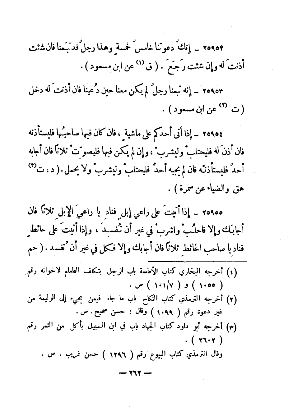 25955- "إذا أتيت على راعي إبل فناد يا راعي الإبل ثلاثا فإن أجابك وإلا فاحلب واشرب في غير أن تفسد، وإذا أتيت على حائط فناديا صاحب الحائط ثلاثا فإن أجابك وإلا فكل في غير أن تفسد". "حم