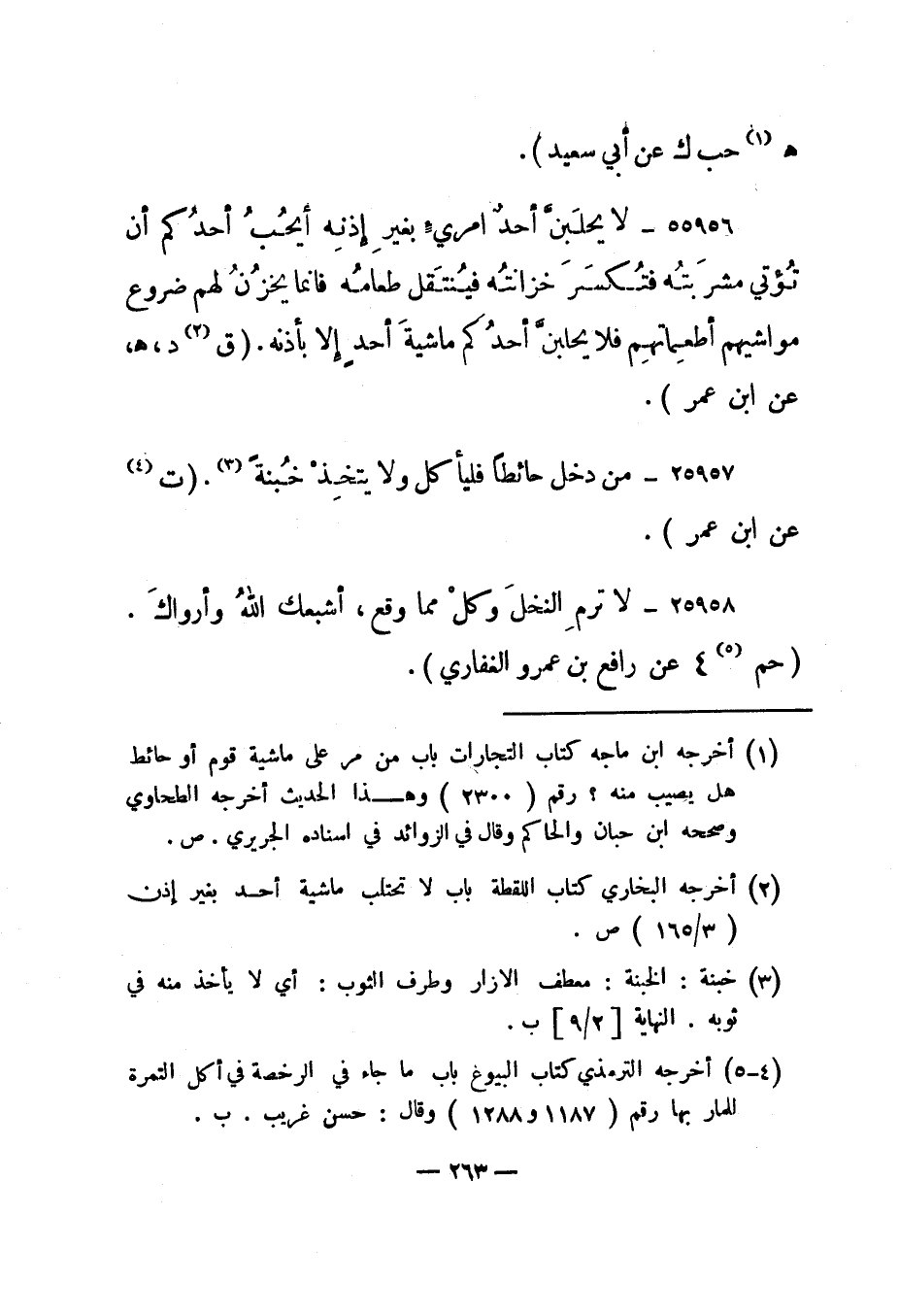25957- "من دخل حائطا فليأكل ولا يتخذ خبنة 3". "ت 4 عن ابن عمر".