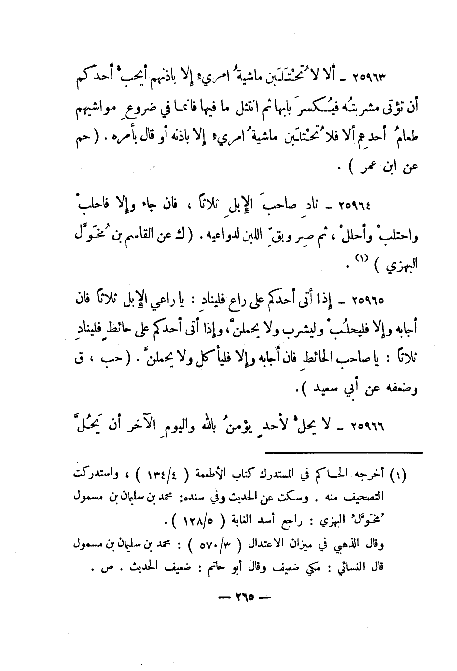 25965- "إذا أتى أحدكم على راع فليناد: يا راعي الإبل ثلاثا فإن أجابه وإلا فليحلب وليشرب ولا يحملن، وإذا أتى أحدكم على حائط فليناد ثلاثا: يا صاحب الحائط فإن أجابه وإلا فليأكل ولا يحملن". "حب، ق وضعفه عن أبي سعيد".
