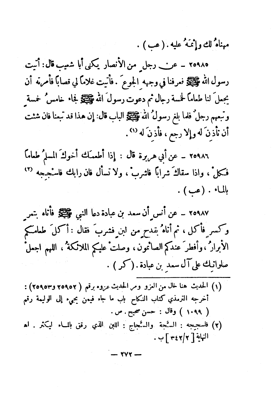 25985-عن رجل من الأنصار يكنى أبا شعيب قال: "أتيت رسول الله صلى الله عليه وسلم فعرفنا في وجهه الجوع. فأتيت غلاما لي قصابا فأمرته أن يجعل لنا طعاما لخمسة رجال ثم دعوت رسول الله صلى الله عليه وسلم فجاء خامس خمسة وتبعهم رجل فلما بلغ رسول الله صلى الله عليه وسلم الباب قال: "إن هذا قد تبعنا فإن شئت أن تأذن له وإلا رجع"، فأذن له" 1.