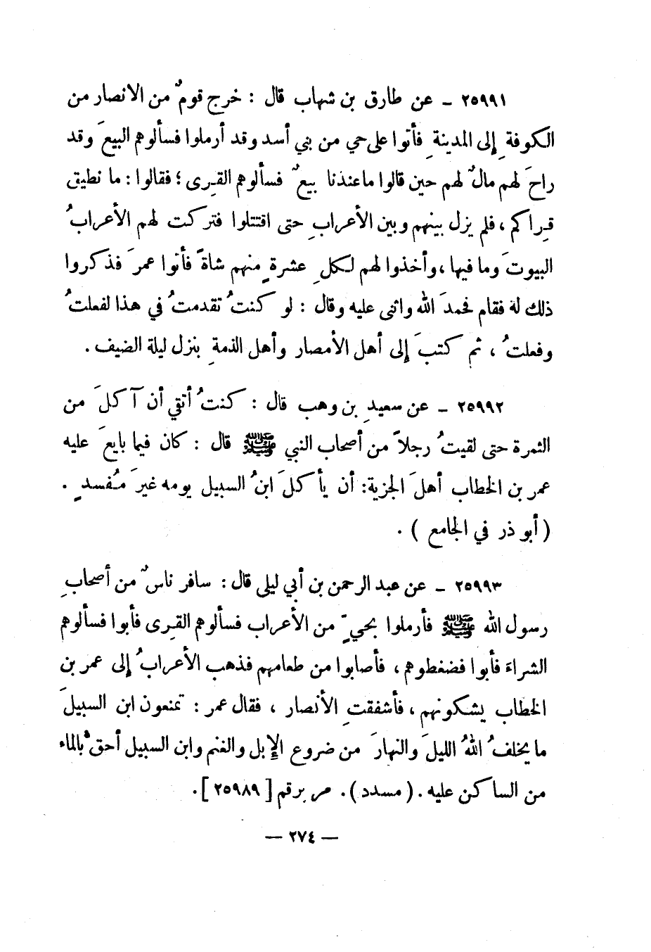 25991- عن طارق بن شهاب قال: "خرج قوم من الأنصار من الكوفة إلى المدينة فأتوا على حي من بني أسد وقد أرملوا فسألوهم البيع وقد راح لهم مال لهم حين قالوا ما عندنا بيع فسألوهم القرى؛ فقالوا: ما نطيق قراكم، فلم يزل بينهم وبين الأعراب حتى اقتتلوا فتركت لهم الأعراب البيوت وما فيها، وأخذوا لهم لكل عشرة منهم شاة فأتوا عمر فذكروا ذلك له فقام فحمد الله وأثنى عليه وقال: لو كنت تقدمت في هذا لفعلت وفعلت، ثم كتب إلى أهل الأمصار وأهل الذمة بنزل ليلة الضيف".
