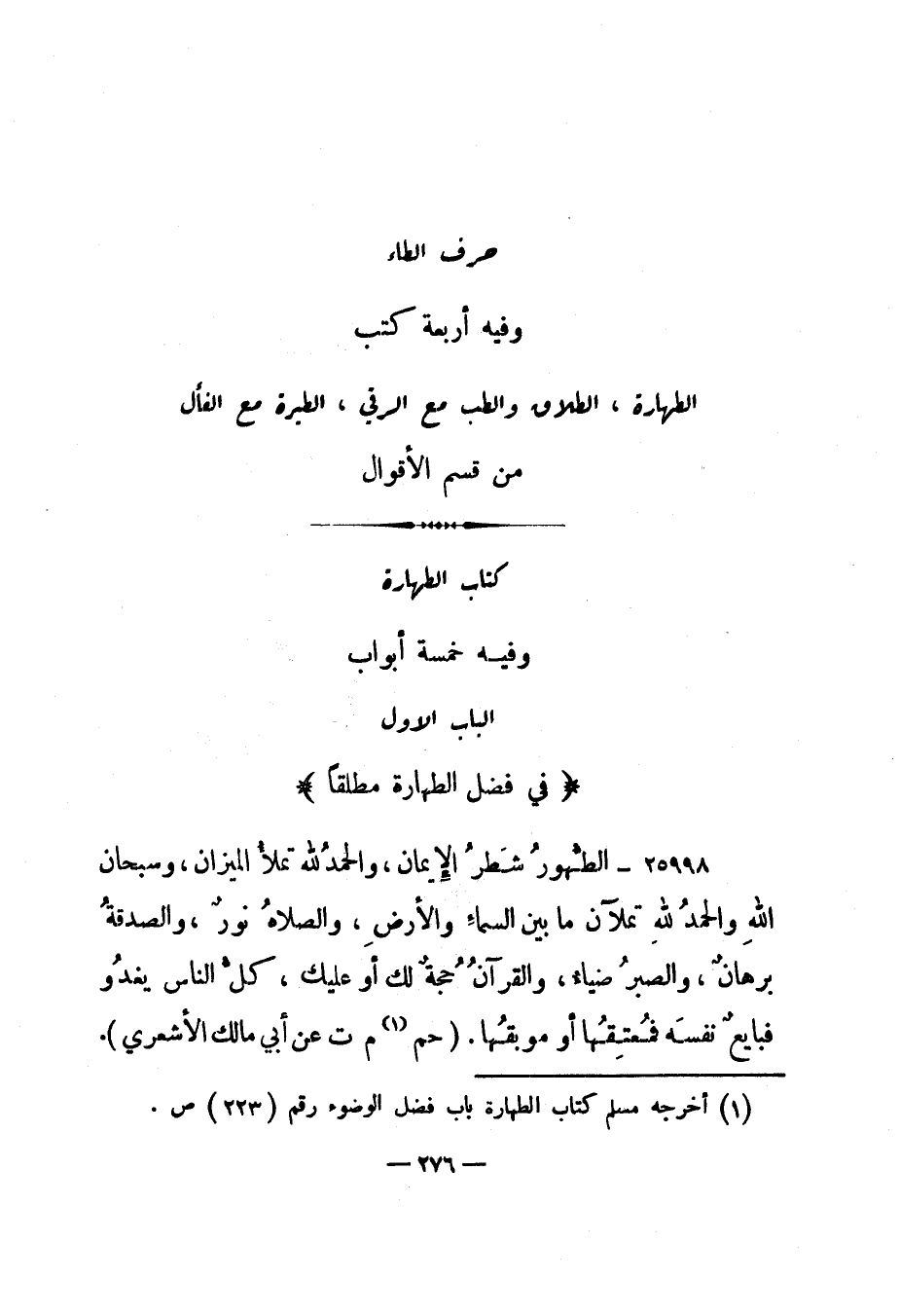 25998 - "الطهور شطر الإيمان، والحمد لله تملأ الميزان، وسبحان الله والحمد لله تملآن ما بين السماء والأرض، والصلاة نور، والصدقة برهان، والصبر ضياء، والقرآن حجة لك أو عليك، كل الناس يغدو فبايع نفسه فمعتقها أو موبقها". "حم 1 م ت عن أبي مالك الأشعري".